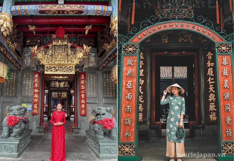 Chùa Bà Thiên Hậu, nổi tiếng với kiến trúc và hoa văn truyền thống, cũng là một địa điểm lý tưởng cho những người muốn lưu giữ khoảnh khắc tĩnh lặng giữa không khí Tết sôi động. Đây là địa điểm chụp hình Tết linh thiêng mang nét đẹp cổ kính, là địa điểm tâm linh có ảnh hưởng đến người dân địa bàn thành phố. Chùa bà Thiên Hậu hiện đang lưu giữ rất nhiều đồ cổ, các bức tranh đắp nổi hình tứ linh (Long, Ly, Quy Phụng) và nhiều tượng đá, chuông,…Người Việt thường hay đi chùa vào dịp đầu năm để cầu mong gia đình khỏe mạnh, an yên. Chính vì vậy, với nét đẹp hoài cổ và linh thiêng thì nơi đây được rất nhiều người đến để xin quẻ và chụp ảnh nghệ thuật đậm chất truyền thống.