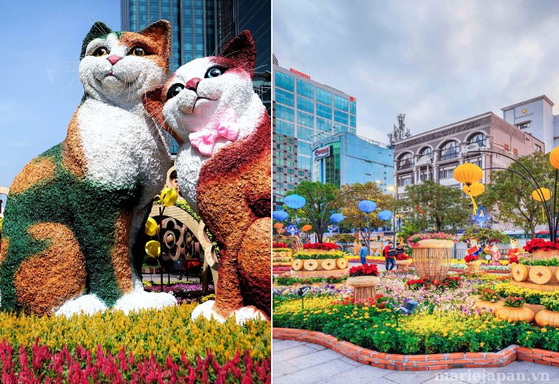 Một trong những địa điểm chụp hình Tết đẹp tại Sài Gòn là Đường Hoa Nguyễn Huệ. Mỗi năm, Đường Hoa Nguyễn Huệ lại trở thành một điểm đến thu hút đông đảo du khách và người dân địa phương. Với hàng nghìn bông hoa đủ màu sắc với kiểu thiết kế độc đáo bao phủ cả con đường, cùng với con vật đại diện cho năm. Đây là địa điểm chụp hình Tết lý tưởng để có những bức ảnh tươi mới và tràn ngập niềm vui của mùa xuân. Đừng quên để lại dấu ấn của bạn giữa sắc hoa rực rỡ tại đây nhé!