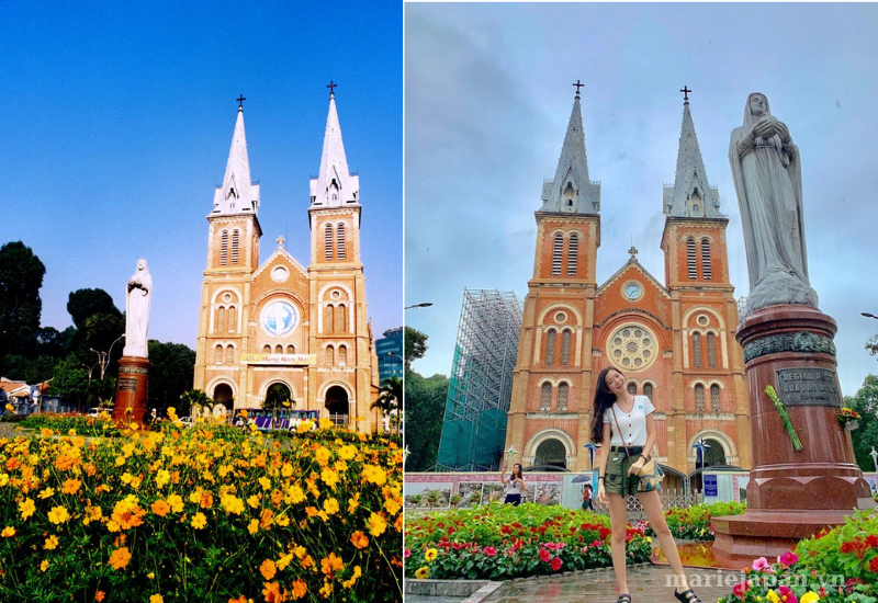 Nhà thờ Đức Bà, biểu tượng kiến trúc tôn giáo của TP.HCM với vẻ ngoài trang trọng và cổ kính nhưng không kém phần hiện đại. Một bức ảnh tại đây không chỉ lưu giữ vẻ đẹp của Nhà thờ Đức Bà mà còn mang đến cho bạn không khí Tết truyền thống. Hiện tại, nhà thờ đang tu sửa, nên các bạn chỉ có thể tham quan bên ngoài. Tuy nhiên, bên ngoài cũng rất đẹp khi có nhiều hoa và khi chụp ảnh vẫn lấy được nhiều góc đẹp và có khung cảnh nhà thờ. Đây cũng là một địa điểm chụp hình Tết đẹp không nên bỏ qua.