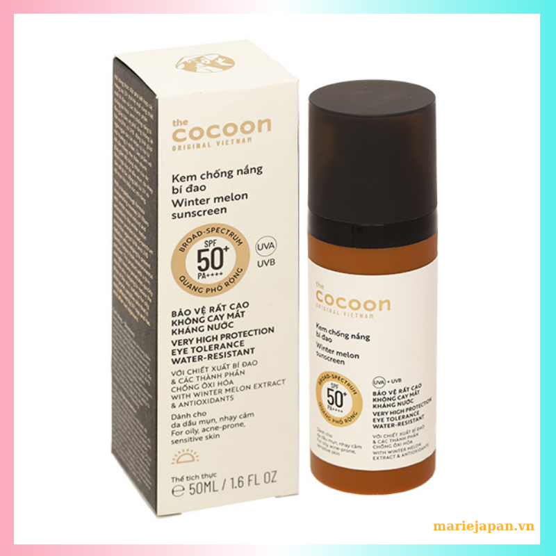 Cocoon là thương hiệu mỹ phẩm thuần chay nổi tiếng tại Việt Nam. Chính vì vậy, kem chống nắng bí đao Cocoon có thành phần an toàn lành tính không chứa cồn, không dầu khoáng, không sulfate, không paraben, không chứa Oxybenzone & Octinoxate thân thiện với rạn san hô. Chỉ số chống nắng SPF 50+, PA++++ giúp chống nắng với khả năng bảo vệ rất cao. Chất dễ tán vào da, không gây ra hiện tượng vón cục hay tạo rãnh trắng. Đồng thời kem chống nắng bí đao Cocoon không gây bóng nhờn hay cay mắt sau khi sử dụng, đặc biệt còn có khả năng kháng nước. Sản phẩm phù hợp da dầu mụn, da nhạy cảm dễ kích ứng, hoặc những ai muốn sử dụng kem chống nắng có độ bảo vệ cao và dùng được cho phụ nữ mang thai.