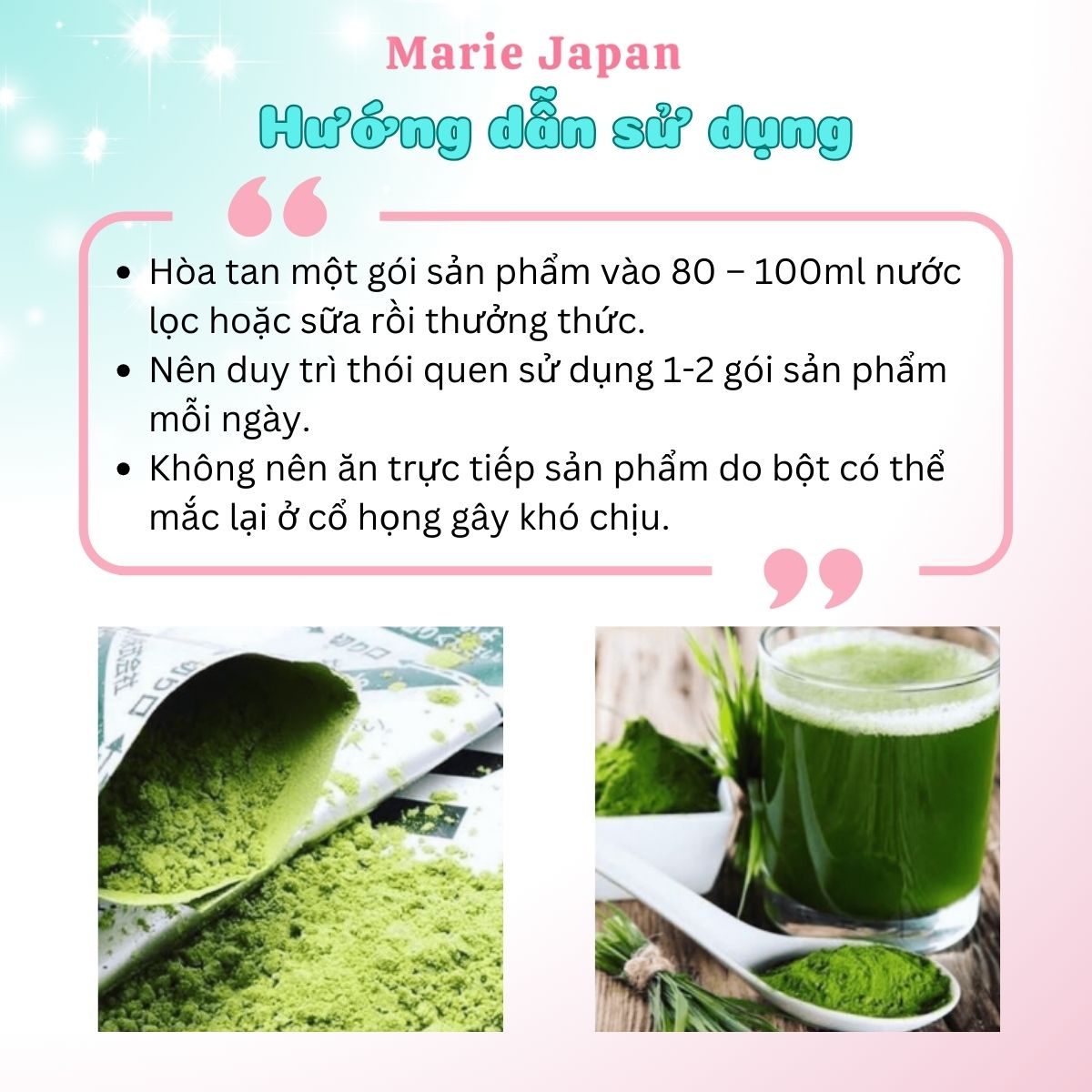 Hòa tan một gói sản phẩm vào 80 – 100ml nước lọc hoặc sữa rồi thưởng thức.