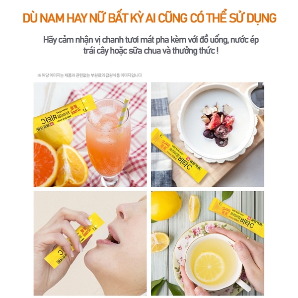 - Cách 2: Cho 1 gói Vita C hòa tan với 200ml nước lọc rồi khuấy đều trước khi sử dụng. Không pha với nước sôi và nước lạnh.