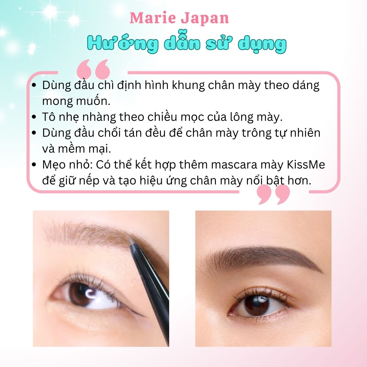 Mẹo nhỏ: Có thể kết hợp thêm mascara mày KissMe để giữ nếp và tạo hiệu ứng chân mày nổi bật hơn.