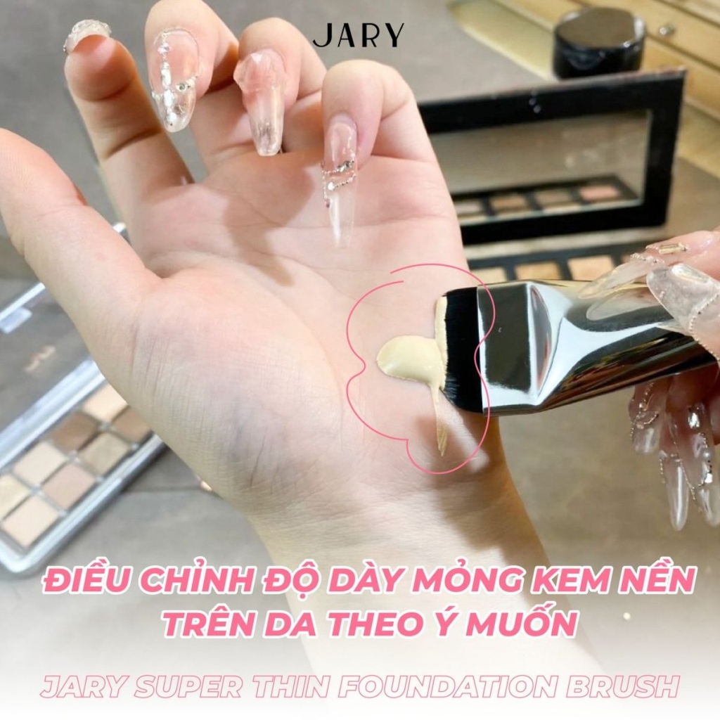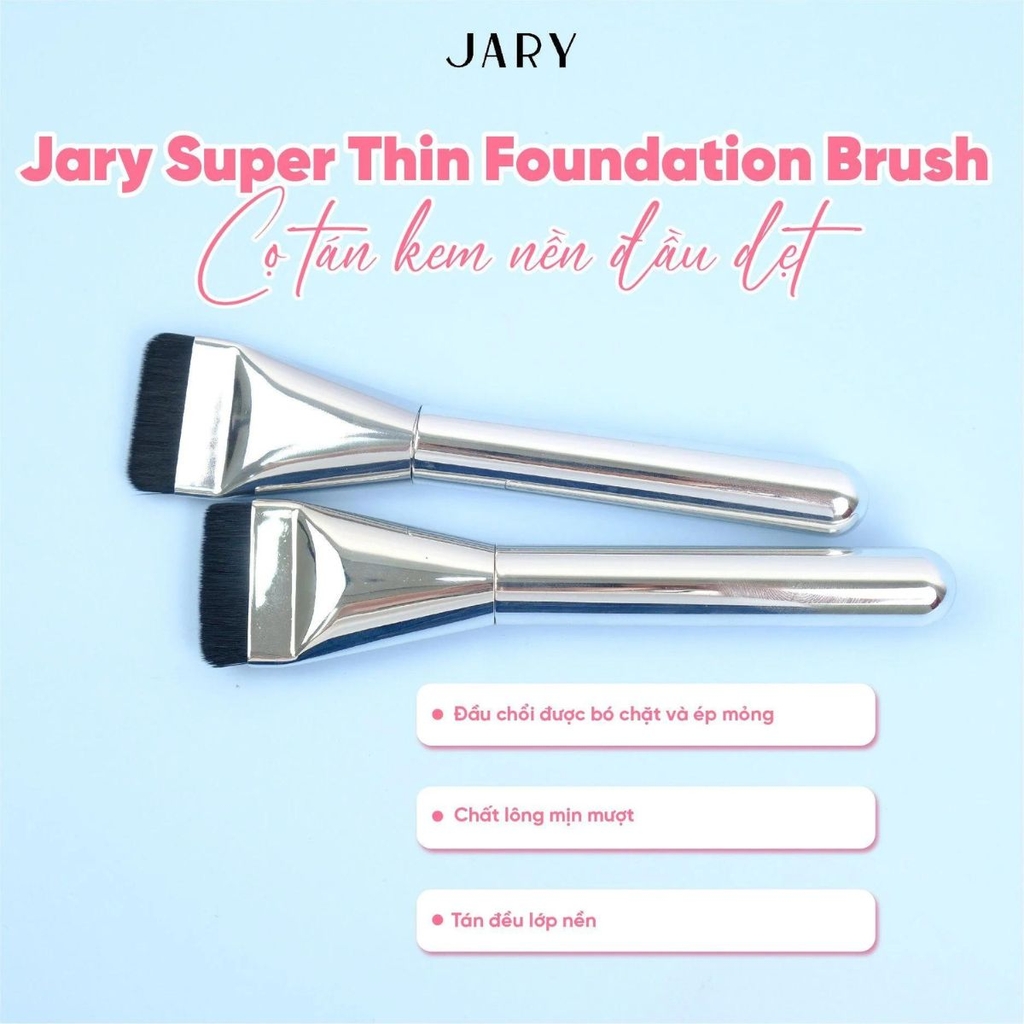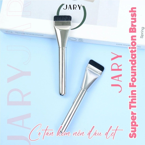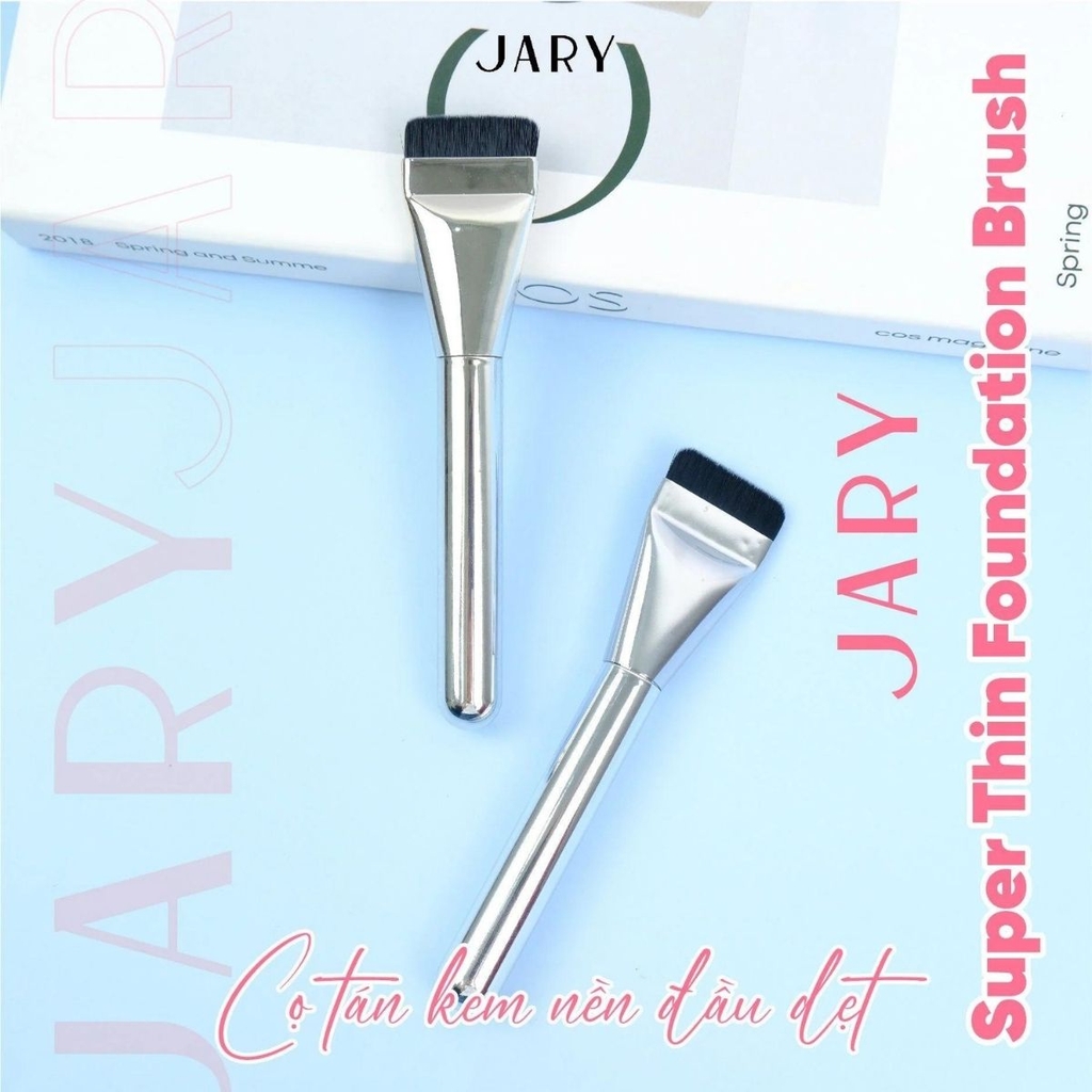 - Cọ tán kem nền dạng lông đầu dẹt Jary Super Thin Foundation Brush với thiết kế ánh bạc chắc chắn cùng shape cọ dẹp ngắn có độ bó chặt giúp lấy sản phẩm lên da nhiều và dễ dàng hơn. Ngoài chức năng dàn đều nền trên da, cọ còn có thể dùng cho các sản phẩm dạng lỏng khác như kem chống nắng, kem lót... Chất lông tổng hợp hiện đang là xu thế hiện nay, bởi độ an toàn và thân thiện với môi trường, thêm vào đó là phù hợp với mọi loại da. Là sự kết hợp hoàn hảo giữa que tán kem nền và cọ trang điểm được ưa chuộng với thiết kế mỏng, dẹt giúp lớp nền khi tán ra được đều, mướt và tệp lì tự nhiên trên da.