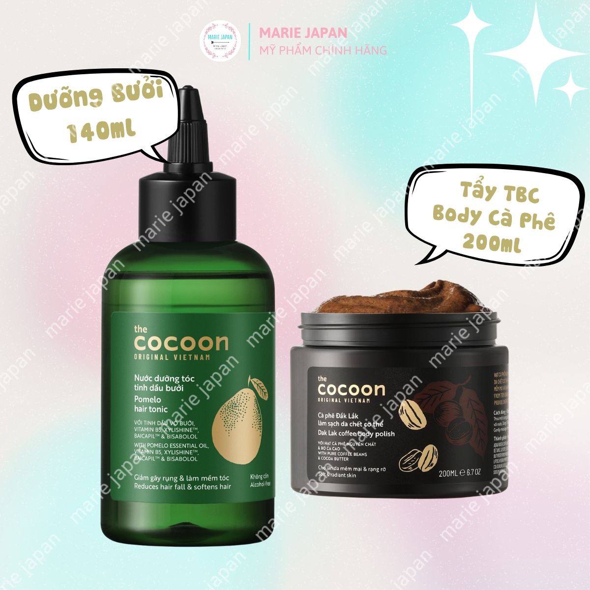 Combo Cocoon 2 Món 1 Tẩy Tế Bào Chết Body Cà Phê Mịn Da 200ml + 1 Xịt Dưỡng Tóc Vỏ Bưởi Giảm Gãy Rụng 140ml