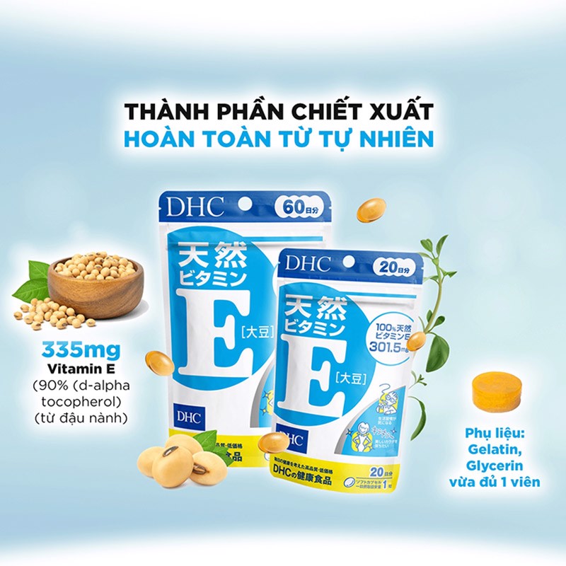 + Viên uống vitamin E DHC có chứa 301.5 mg d-a tocopherol tự nhiên, là dạng vitamin E có hiệu quả tối ưu nhất và được khuyến nghị dùng mỗi ngày.