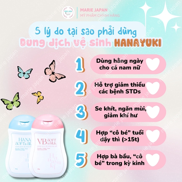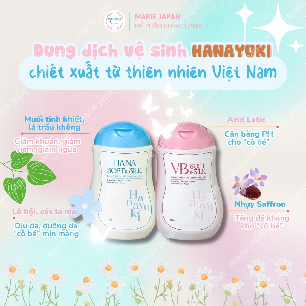 Ngày nay, vấn đề về bệnh phụ khoa được chị em hết sức chú trọng. Vấn đề phụ khoa là nguyên nhân gây nên nhiều căn bệnh khó chữa và khó chịu đối với chị em phụ nữ. Chính vì vậy, đã là phụ nữ hiện đại, chị em chúng ta không thể thiếu dung dịch vệ sinh “vùng kín” để ngăn ngừa các vấn đề về bệnh phụ khoa. Một trong những dung dịch vệ sinh phụ nữ mà Marie tâm đắc nhất chính là “Dung dịch vệ sinh phụ nữ Hana Soft Silk Hanayuki”. Cùng Marie tìm hiểu về sản phẩm này nhé !!!