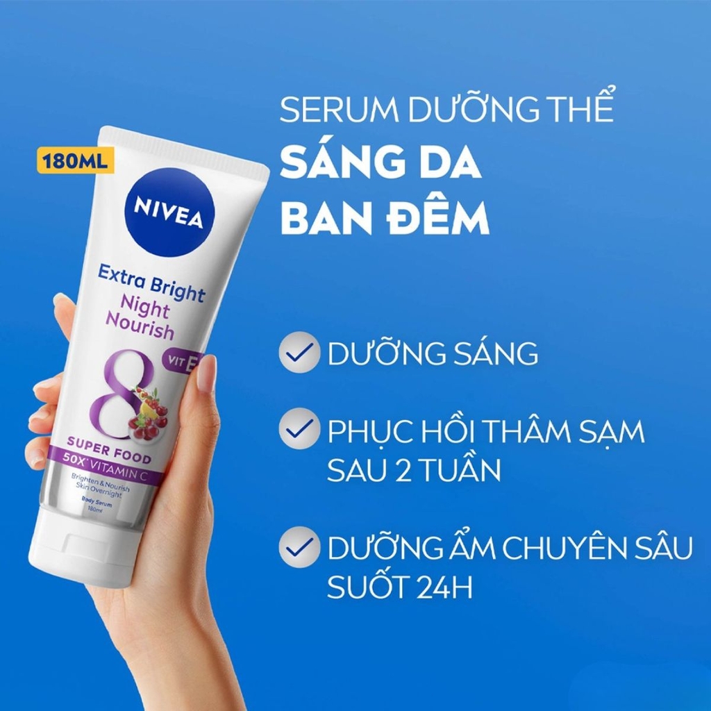 ✨ Dưỡng Thể Nivea 8 Super Food Extra Bright Night Nourish là dòng sữa dưỡng thể ban đêm kết hợp sức mạnh từ 8 loại siêu thực phẩm giàu dưỡng chất, giúp nuôi dưỡng, phục hồi và tái tạo làn da khi ngủ. Sản phẩm giúp da mềm mại, mịn màng, hỗ trợ làm sáng và đều màu da, đồng thời cung cấp độ ẩm sâu, giảm khô ráp hiệu quả.