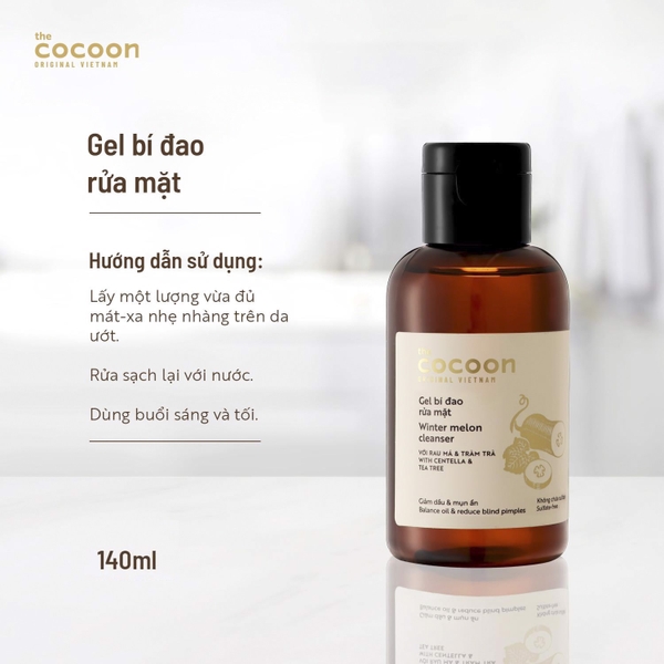 Gel Rửa Mặt Làm Sạch Da Dịu Nhẹ Chiết Xuất Bí Đao The Cocoon Winter Melon Cleanser là gel rửa mặt với các thành phần gồm bí đao, rau má, tràm trà, bổ sung thêm vitamin B3, B5 và Betaine và có độ pH 5.5 giúp làm sạch sâu bụi bẩn và dầu thừa, ngăn ngừa hình thành mụn ẩn mà vẫn giữ được độ ẩm mịn tự nhiên và không gây khô căng da sau khi sử dụng thuộc thương hiệu mỹ phẩm thuần chay Cocoon đến từ Việt Nam.