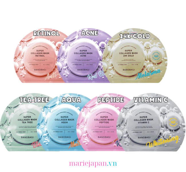 - Với loại mặt nạ Banobagi Super Collagen mask Tea Tree (xanh lá): giúp làm dịu da, giảm sưng viêm, giảm mụn đầu đen, chống lão hóa và hỗ trợ tẩy tế bào chết cho da.
