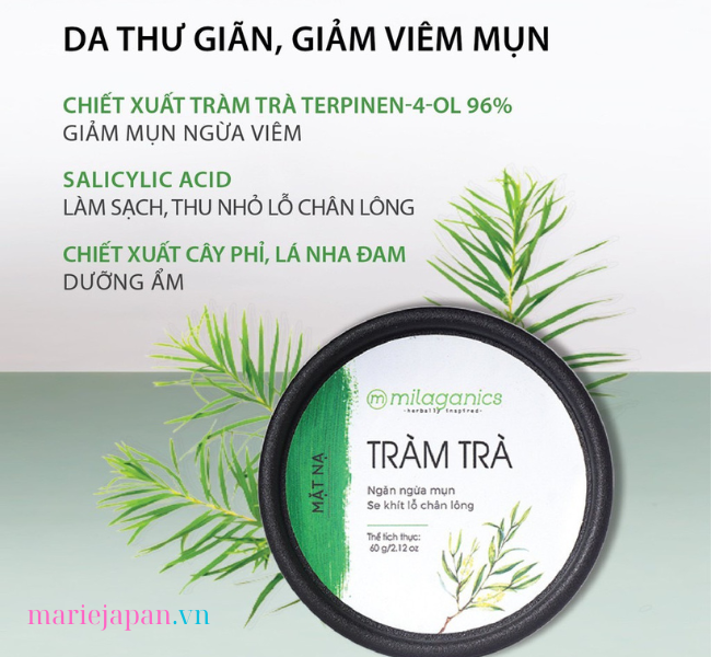 Đây là một trong những loại mặt nạ dành cho da mụn tốt nhất có xuất xứ Việt Nam. Sản phẩm có chứa các loại thành phần đặc trị cho da mụn như tinh dầu tràm trà, salysylic acid giúp laoji bỏ dầu thừa, giảm sưng và phục hồi da. Ngoài ra còn có chiết xuất cây phỉ và lá nha đam, vitamin B5, E, B3 giúp cấp ẩm, làm dịu nhẹ và sáng da.