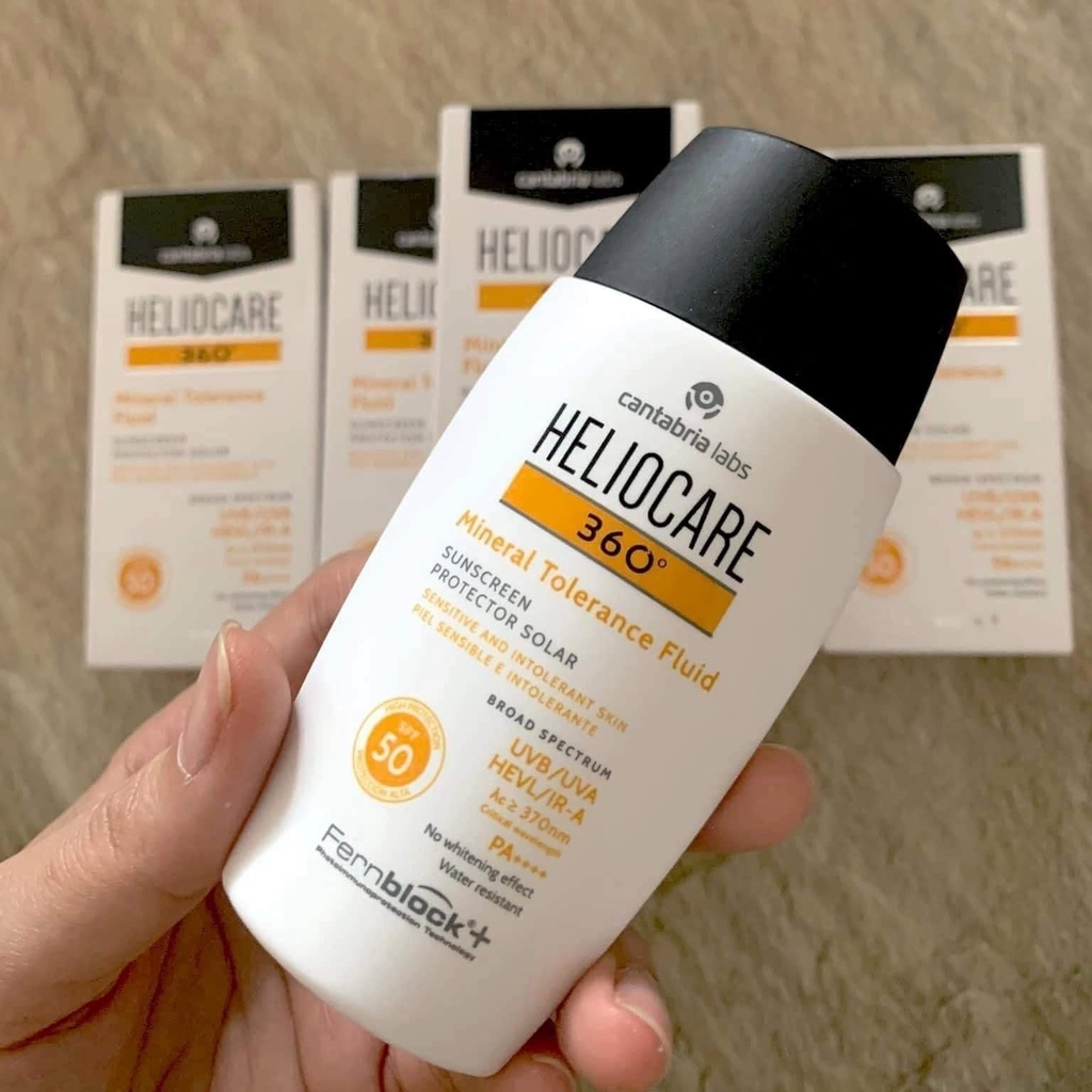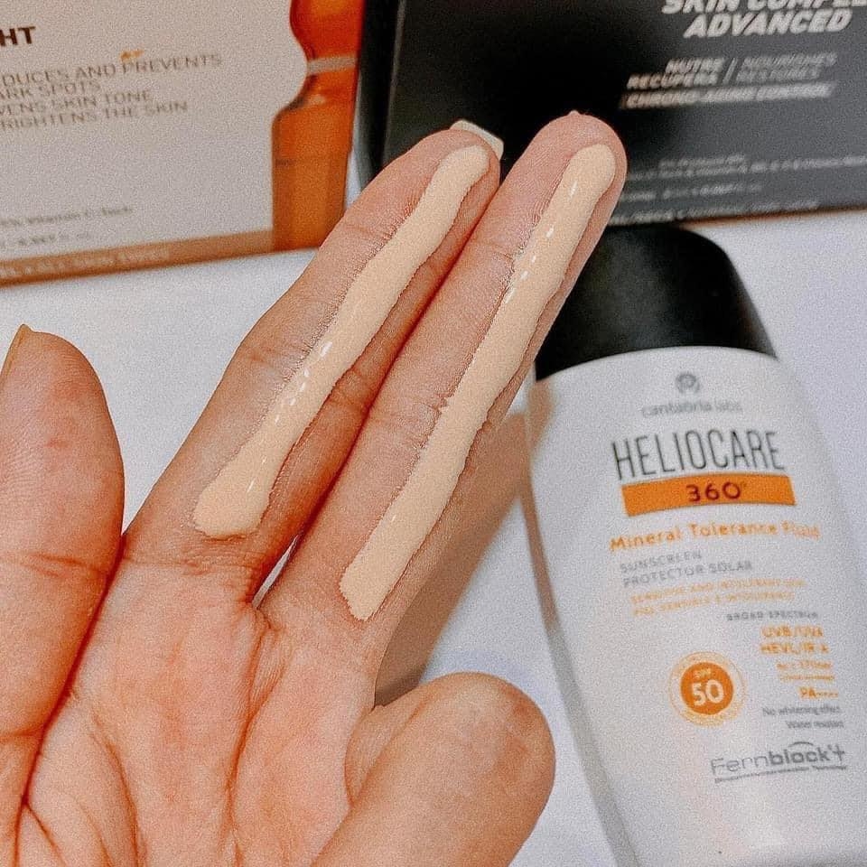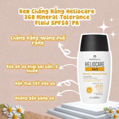 Kem chống nắng Heliocare 360 Mineral Tolerance Fluid SPF 50 PA++++ là kem chống nắng chứa bộ lọc khoáng 100%. Cùng với Fernblock và các hoạt chất và chất chống oxy hóa khác, nó đáp ứng các tiêu chuẩn cao nhất về bảo vệ da chống lại ánh sáng mặt trời. Nó bao gồm một loạt các bảo vệ da chống lại UVA / UVB, hồng ngoại và ánh sáng nhìn thấy. Trung hòa các gốc tự do, phục hồi làn da bị hư hại.