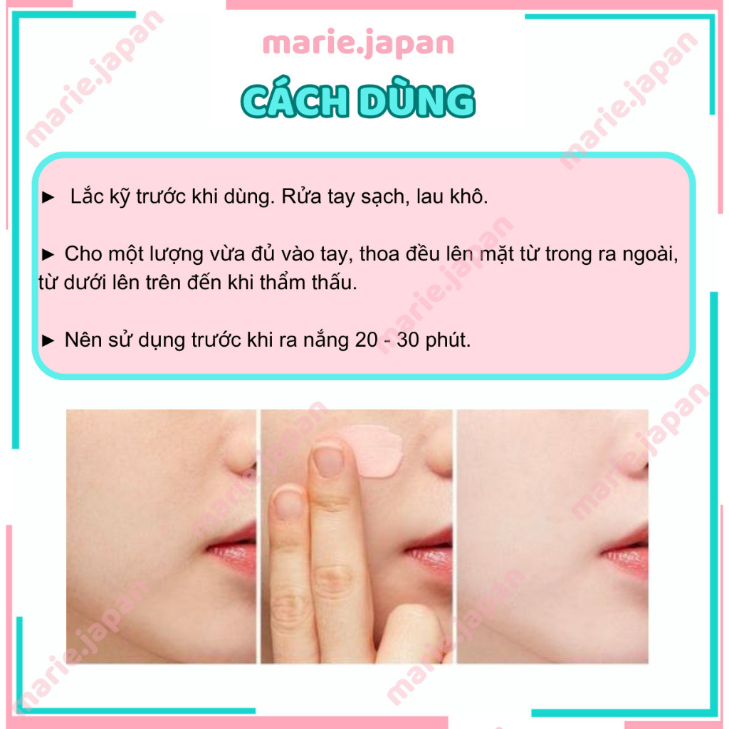 Lấy một lượng thích hợp sản phẩm này và thoa đều trên da trước khi ra nắng 30 phút hoặc trước khi trang điểm