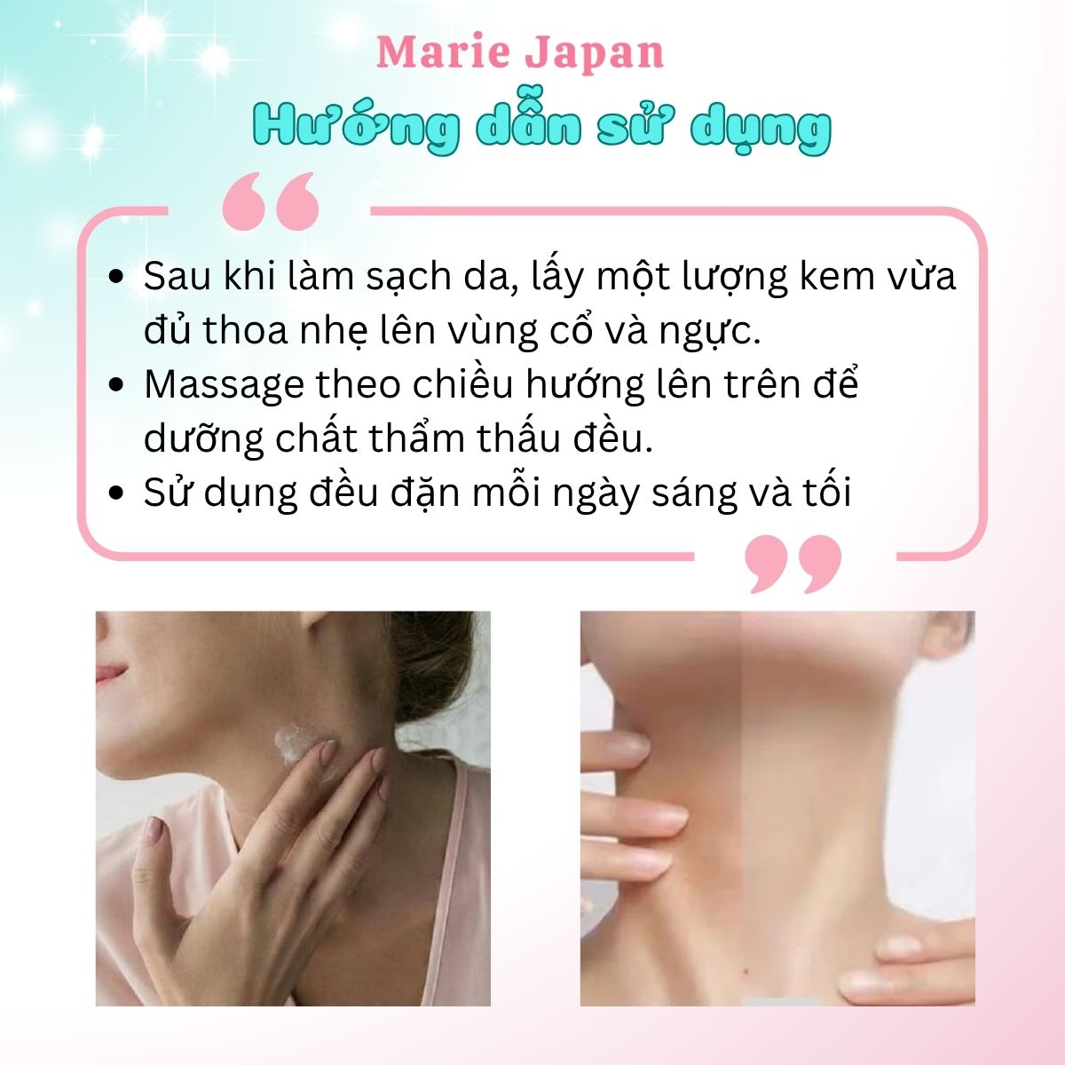 Sau khi làm sạch da, lấy một lượng kem vừa đủ thoa nhẹ lên vùng cổ và ngực.