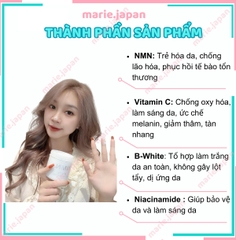 - Thành phần NMN hot hit này thì quá quen với chức năng nổi bật là cải lão hoàn đồng. Nó có công dụng ngăn ngừa lão hóa, trẻ hóa làn da, giảm sự hình thành nếp nhăn, phục hồi và sửa chữa tổn thương cho da, tăng sản sinh collagen và Elastin, cải thiện độ đàn hồi cho da...