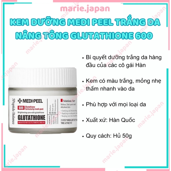 - Glutathione 600 Medi peel còn chứa Niacinamide là một dẫn xuất của Vitamin B3 giúp da nhanh chóng hồi phục, chống sạm màu, lão hóa và mất nước.