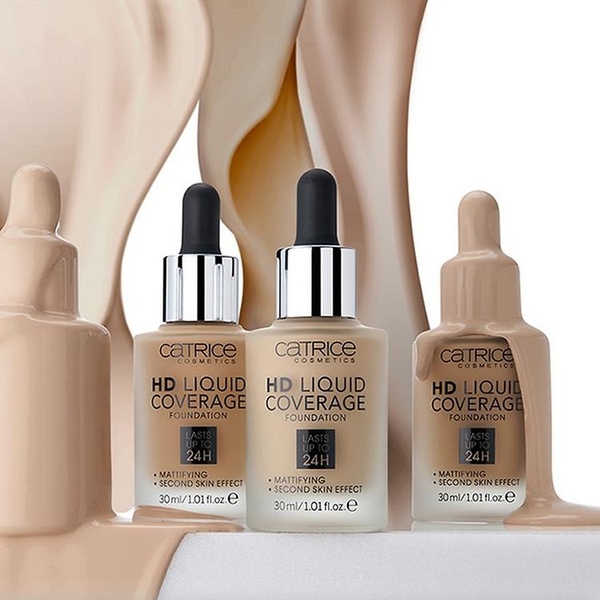 - Kem Nền Catrice HD Liquid Coverage Foundation tạo một lớp nền mỏng, đều màu, trong suốt. Không chỉ là sản phẩm trang điểm mà kem còn có tác dụng như một loại kem dưỡng. Một nghiên cứu về da liễu cho thấy chỉ sau 8 tuần sử dụng hàng ngày, các đốm sẫm màu có thể sáng lên trông thấy, ngăn sự ửng đỏ trên da.