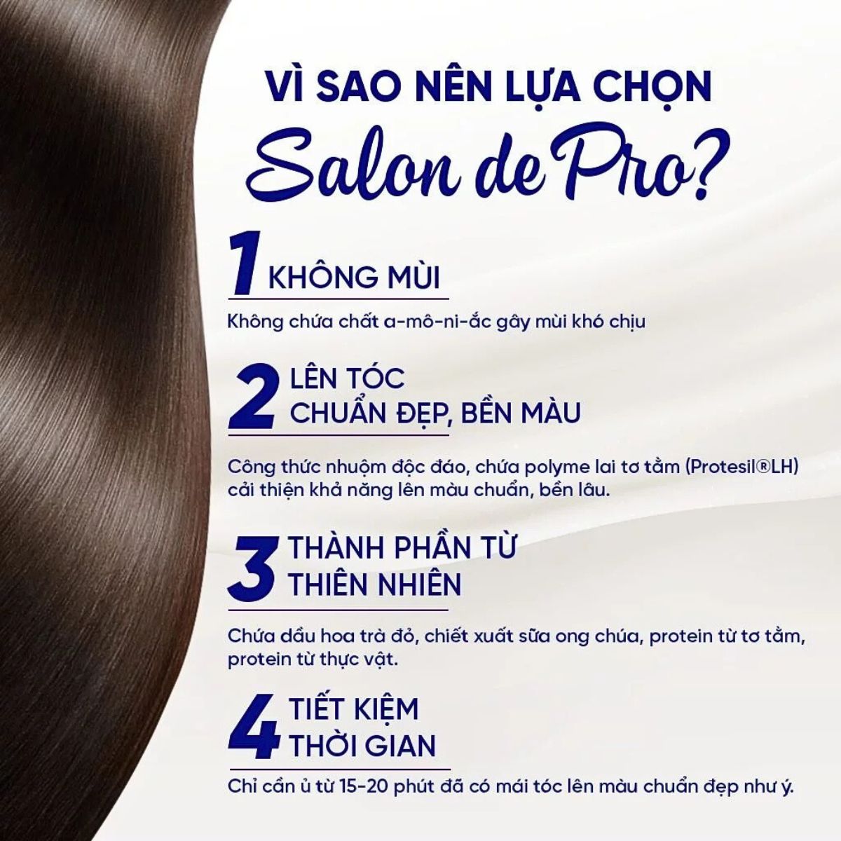 ✨Kem Nhuộm Tóc Salon De Pro là dòng sản phẩm nhuộm phủ bạc dành cho nữ với công thức dịu nhẹ, giúp che phủ tóc bạc nhanh chóng, lên màu tự nhiên và giữ màu lâu. Chất kem mịn dễ thoa, không chảy, phù hợp dùng tại nhà mà vẫn mang lại hiệu quả như salon. Sản phẩm giúp mái tóc trông dày hơn, bóng khỏe và đều màu sau khi nhuộm.