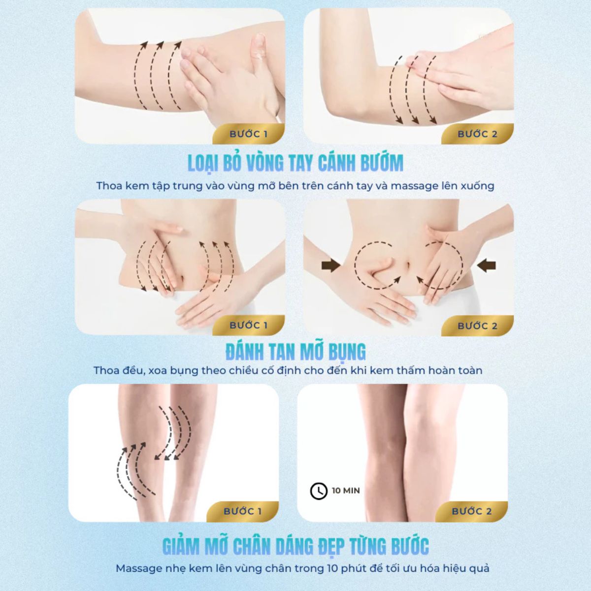 Buổi Sáng (Slim Trắng): Sau khi tắm, thoa một lượng kem vừa đủ lên vùng bụng, eo và các vùng da bị sần vỏ cam.