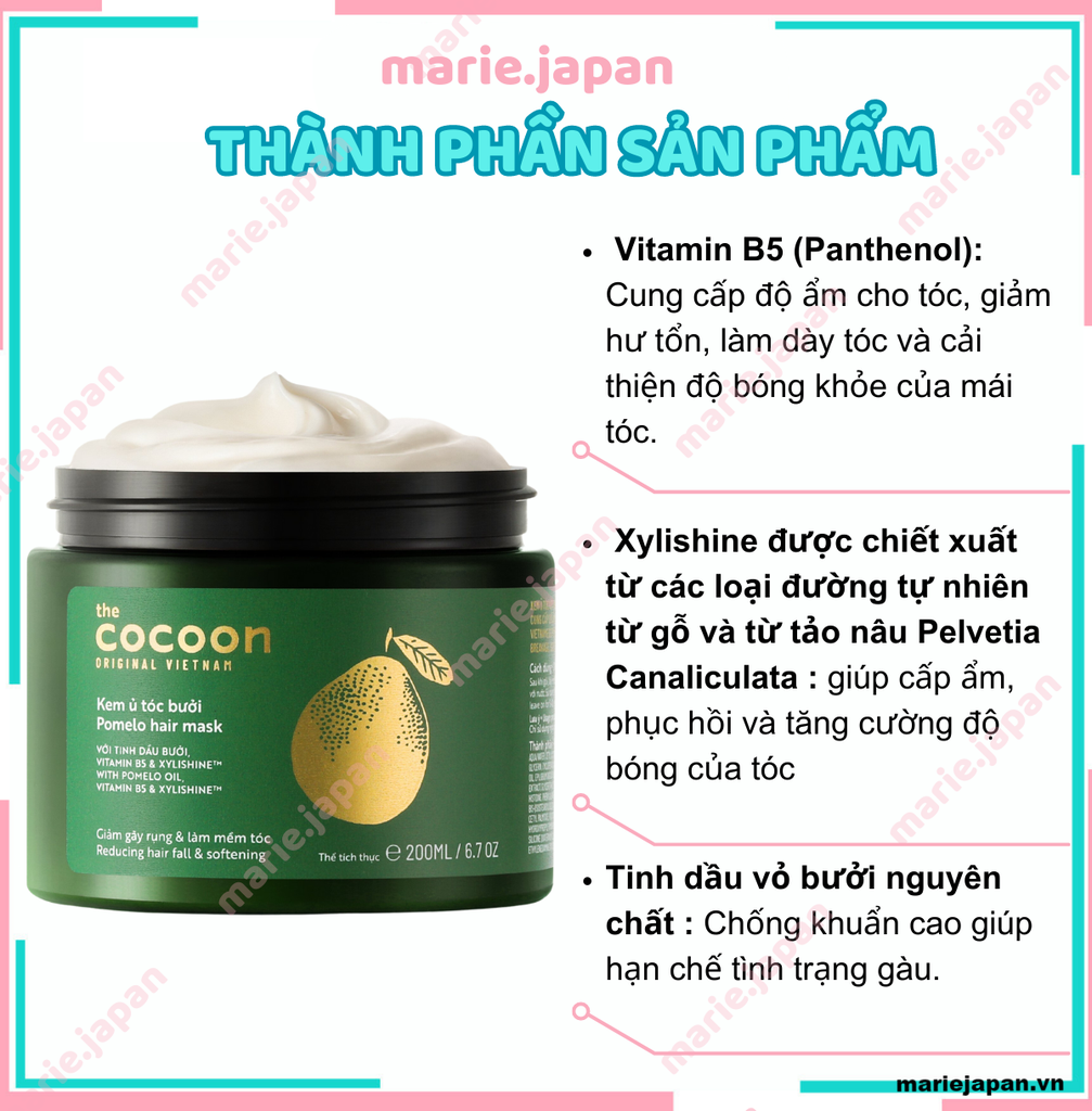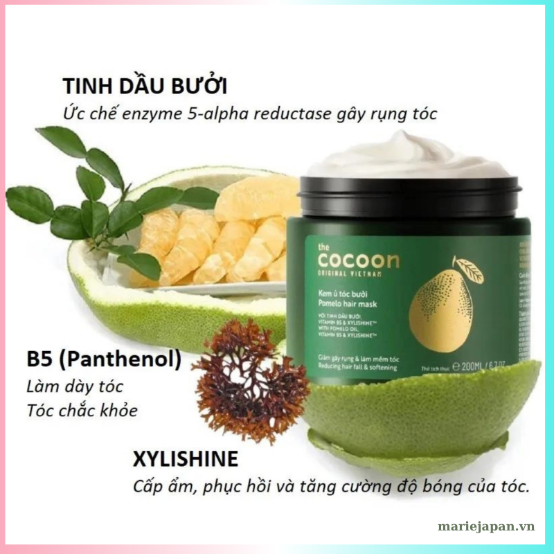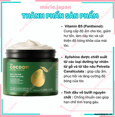 Cocoon là một thương hiệu tiên phong trong việc sản xuất mỹ phẩm thuần chay. Chính vì vậy kem ủ tóc bưởi Cocoon có thành phần tự nhiên và nhiều thành phần giúp tóc chắc khỏe, giảm gãy rụng tóc. Thành phần chính gồm: