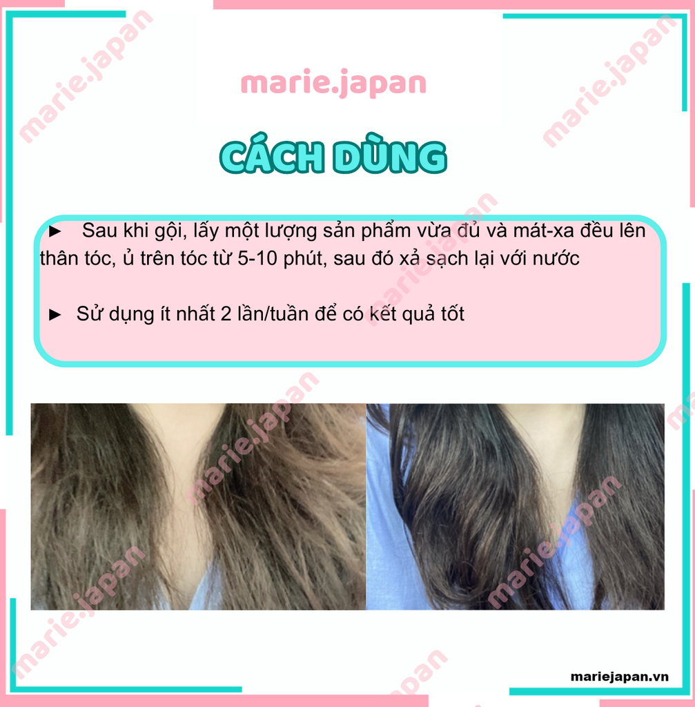 - Làm mềm sợi tóc, phục hồi và giúp tóc suôn mượt vào nếp. Đồng thời cung cấp độ ẩm, cải thiện độ bóng khỏe và làm dày tóc.