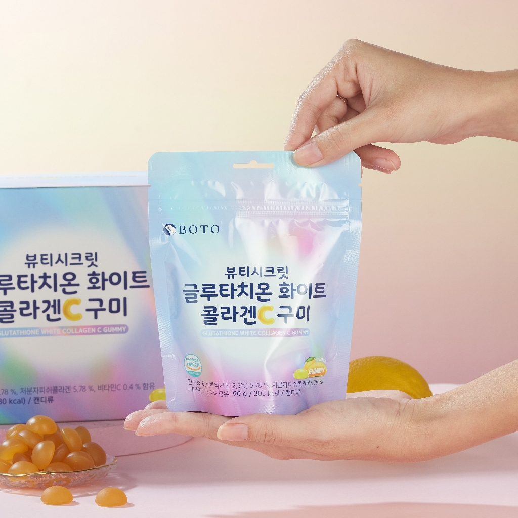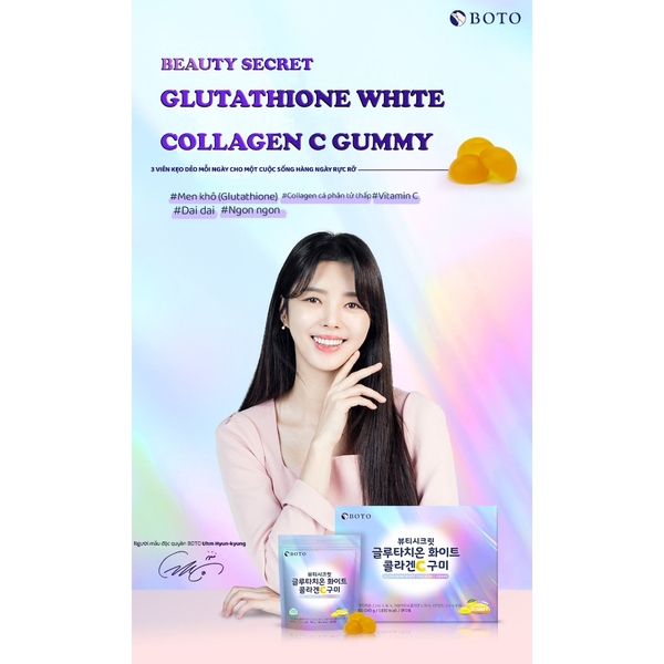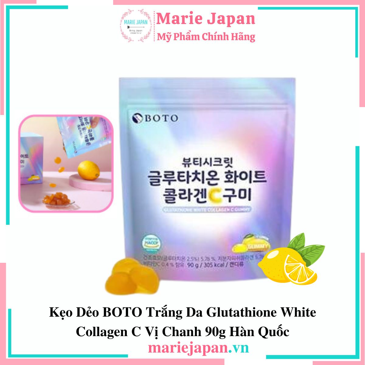 - Kẹo Dẻo Vị Chanh Bổ Sung Collagen, Glutathione Boto Beauty Secret Glutathione White Collagen C Gummy với vị chanh chua ngọt thanh mát, không những giúp bổ sung collagen và vitamin C cho cơ thể mà còn hỗ trợ đem lại làn da tươi trẻ và mịn màng trắng khoẻ hơn nhờ vào Glutathione sau khi sử dụng.