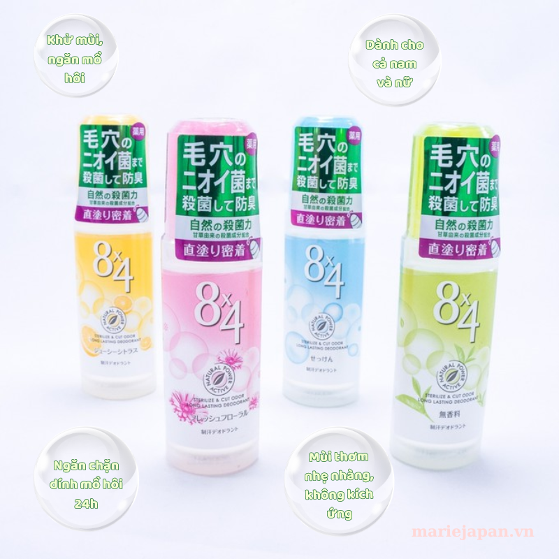 - Lăn khử mùi 8x4 của Nhật 45ml NEW của hãng Kao Nhật Bản với tinh chất β-glycyrrhetinic acid và thành phần diệt khuẩn BGA, giúp ngăn chặn mồ hồi và ngăn mùi hiệu quả. Sản phẩm không gây nhờn dính, giúp da khô thoáng. Lăn khử mùi 8x4 có các thành phần hoàn toàn tự nhiên không gây kích ứng da, khử mùi dài lâu.