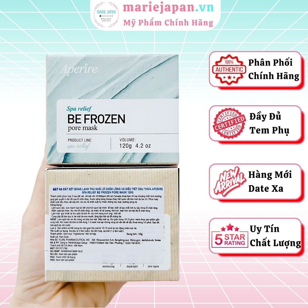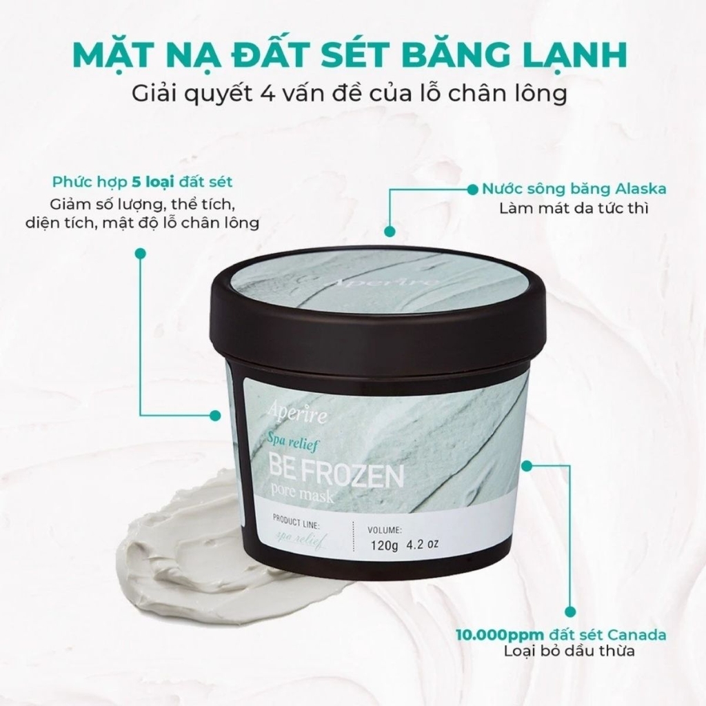 Mặt nạ đất sét Aperire Spa Relief BE FROZEN Pore Mask là sản phẩm đến từ Hàn Quốc, nổi tiếng với khả năng thu nhỏ lỗ chân lông, điều tiết dầu thừa. Sản phẩm chứa hàm lượng cao đất sét bùn băng Canada, nước sông băng Alaska giúp hút sạch dầu thừa, loại bỏ bã nhờn sâu bên trong lỗ chân lông một cách dễ dàng.