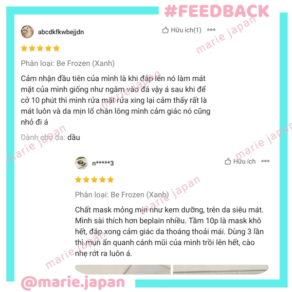 “Cảm nhận đầu tiên của mình là khi đắp lên nó làm mát mặt của mình giống như ngâm vào đá vậy á sau khi để cỡ 10 phút thì mình rửa mặt rửa xong lại cảm thấy rất là mát luôn và da mịn lỗ chân lông mình cảm giác nó cũng nhỏ đi á”