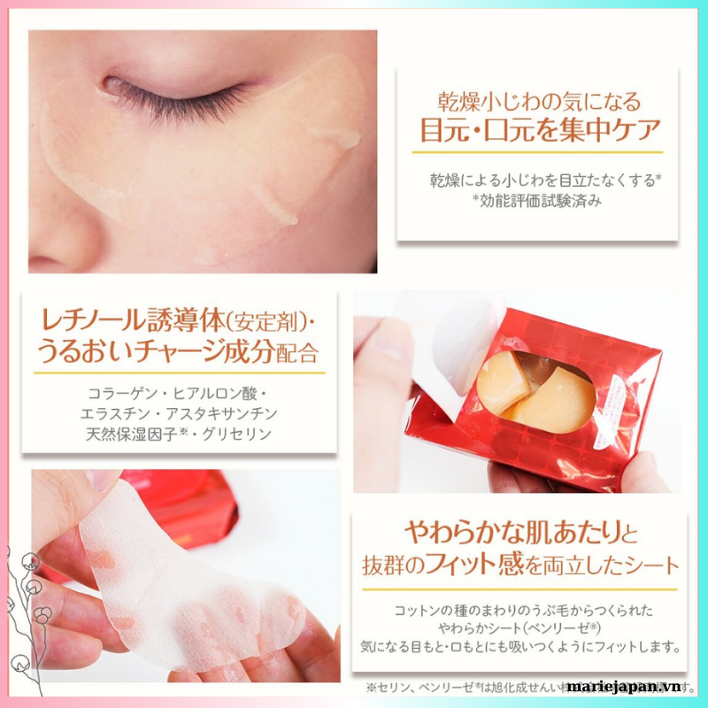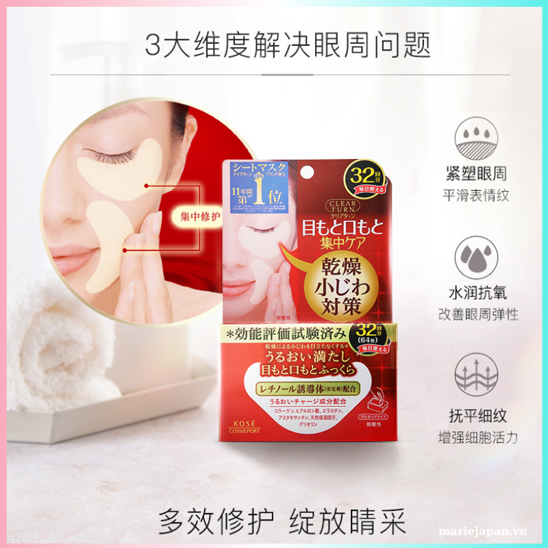 Mặt nạ mắt Kose Clear Turn Moist Nhật Bản có công dụng hiệu quả trong việc chống lão hóa vùng da mắt cũng như vùng khóe miệng. Công dụng cụ thể: