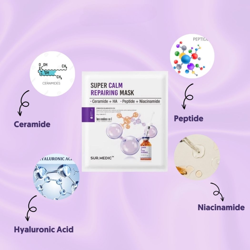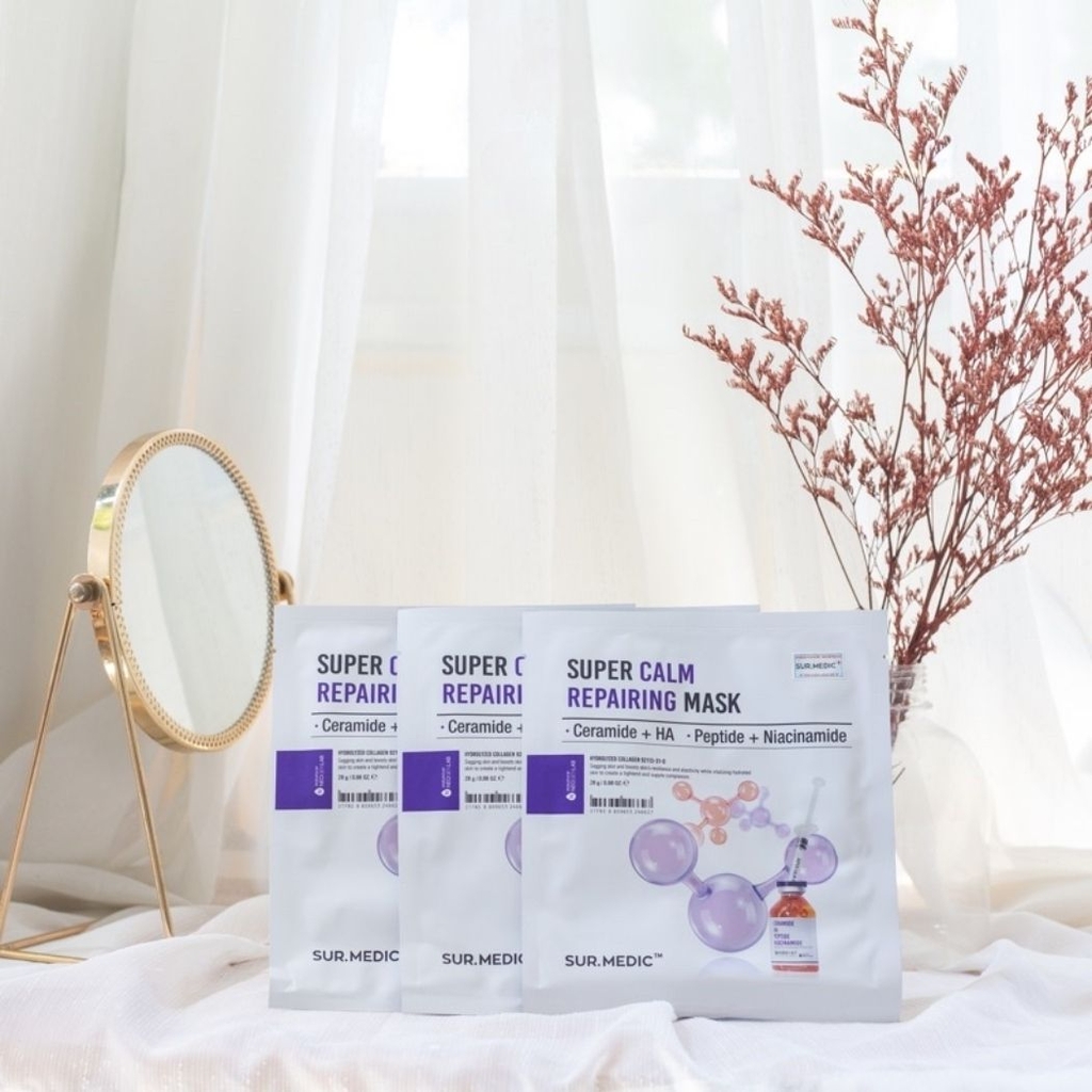 Mặt Nạ Phục Hồi, Làm Dịu Da Cấp Tốc Sur.Medic+ Super Calm Repairing Mask là mặt nạ với phức hợp 5 loại Ceramide, 3 loại HA, 2 loại Peptide và Niacinamide cùng công nghệ Hydrolyzed Collagen tăng cường khả năng hấp thụ dưỡng chất của da giúp phục hồi, làm dịu da tức thì, giảm tình trạng kích ứng, tăng độ đàn hồi, xây dựng hàng rào bảo vệ da vững chắc và cấp ẩm sâu chỉ sau 15 phút mang lại làn da mềm mịn, ẩm mượt thuộc thương hiệu Sur.Medic đến từ Hàn Quốc.