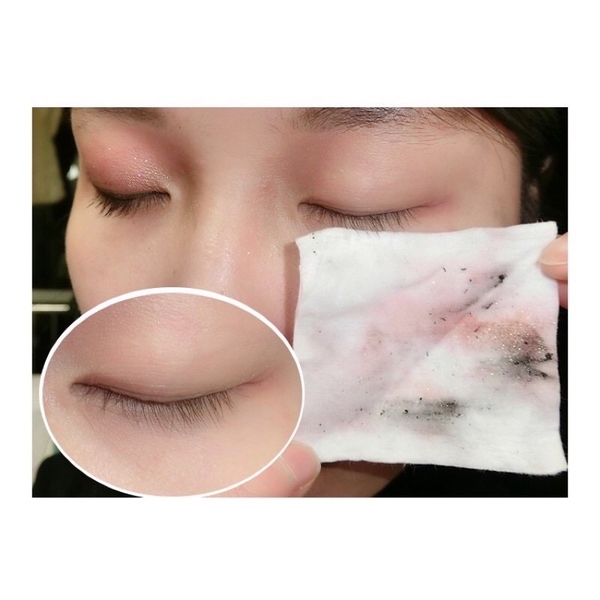 - Dùng bông đã thấm nước tẩy trang lau bắt đầu từ mắt, môi, sau đó toàn bộ khuôn mặt