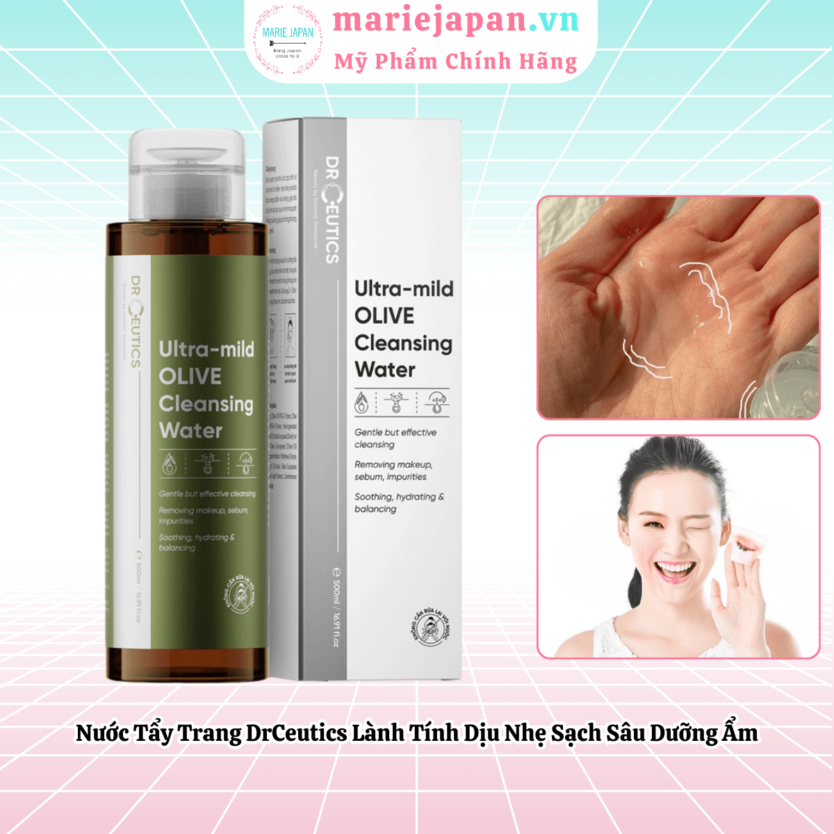 Nước tẩy trang DrCeutics Ultra-mild Olive Cleansing Water là sản phẩm tẩy trang nổi bật từ thương hiệu DrCeutics của Việt Nam. Bảng thành phần an toàn và lành tính giúp làm sạch sâu, loại bỏ bụi bẩn cũng như lớp trang điểm một cách nhẹ nhàng mà không gây cay mắt. Nước tẩy trang DrCeutics phù hợp với mọi loại da, mang đến cho chị em làn da sạch sẽ, mịn màng và thông thoáng.