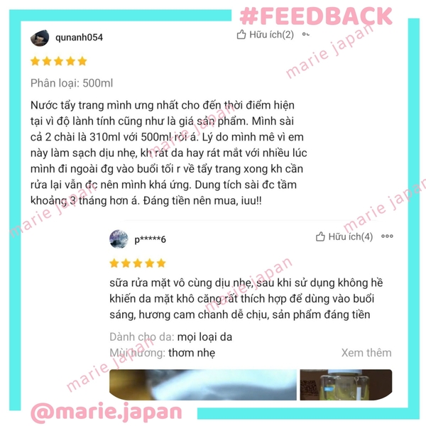 “Nước tẩy trang mình ưng nhất cho đến thời điểm hiện tại vì độ lành tính cũng như là giá sản phẩm. Mình xài cả 2 chài là 310ml với 500ml ròi á. Lý do mình mê vì em này làm sạch dịu nhẹ, không rát da hay rát mắt với nhiều lúc mình đi ngoài đường vào buổi tối rồi về tẩy trang xong không cần rửa lại vẫn được nên mình khá ưng. Dung tích xài được tầm khoảng 3 tháng hơn á. Đáng tiền nên mua, iuu!!”