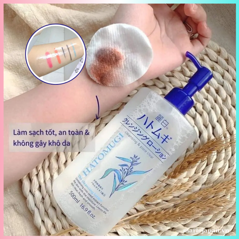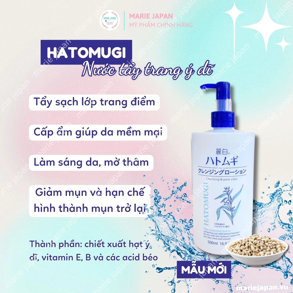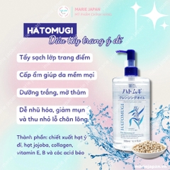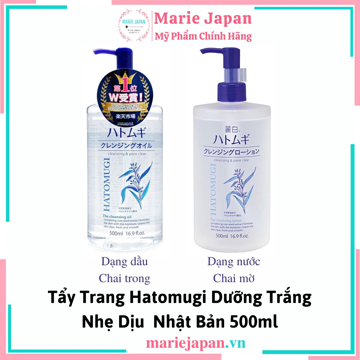 Nước tẩy trang hay dầu tẩy trang là một món không thể thiếu đối với cả nam lẫn nữ. Mỗi ngày ra ngoài phải make up, hoặc tiếp xúc với nhiều bụi bẩn từ môi trường, kể cả ở nhà thì da cũng tiếp xúc với bụi và đổ dầu nhờn. Chính vì vậy, việc tẩy trang là hết sức cần thiết để làm sạch da và tránh tình trạng da bị mụn. Marie giới thiệu đến các bạn “Tẩy trang Hatomugi dưỡng trắng nhẹ dịu Nhật Bản 500ml”. Đây là một sản phẩm tẩy trang được khá nhiều chị em yêu thích. Cùng Marie tìm hiểu thêm về sản phẩm này nhé!!!