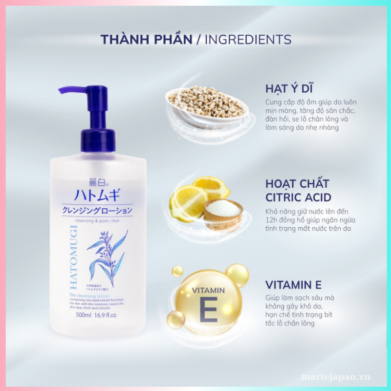 Tẩy trang Hatomugi có thành phần an toàn từ thiên nhiên, dịu nhẹ lành tính. Cụ thể: