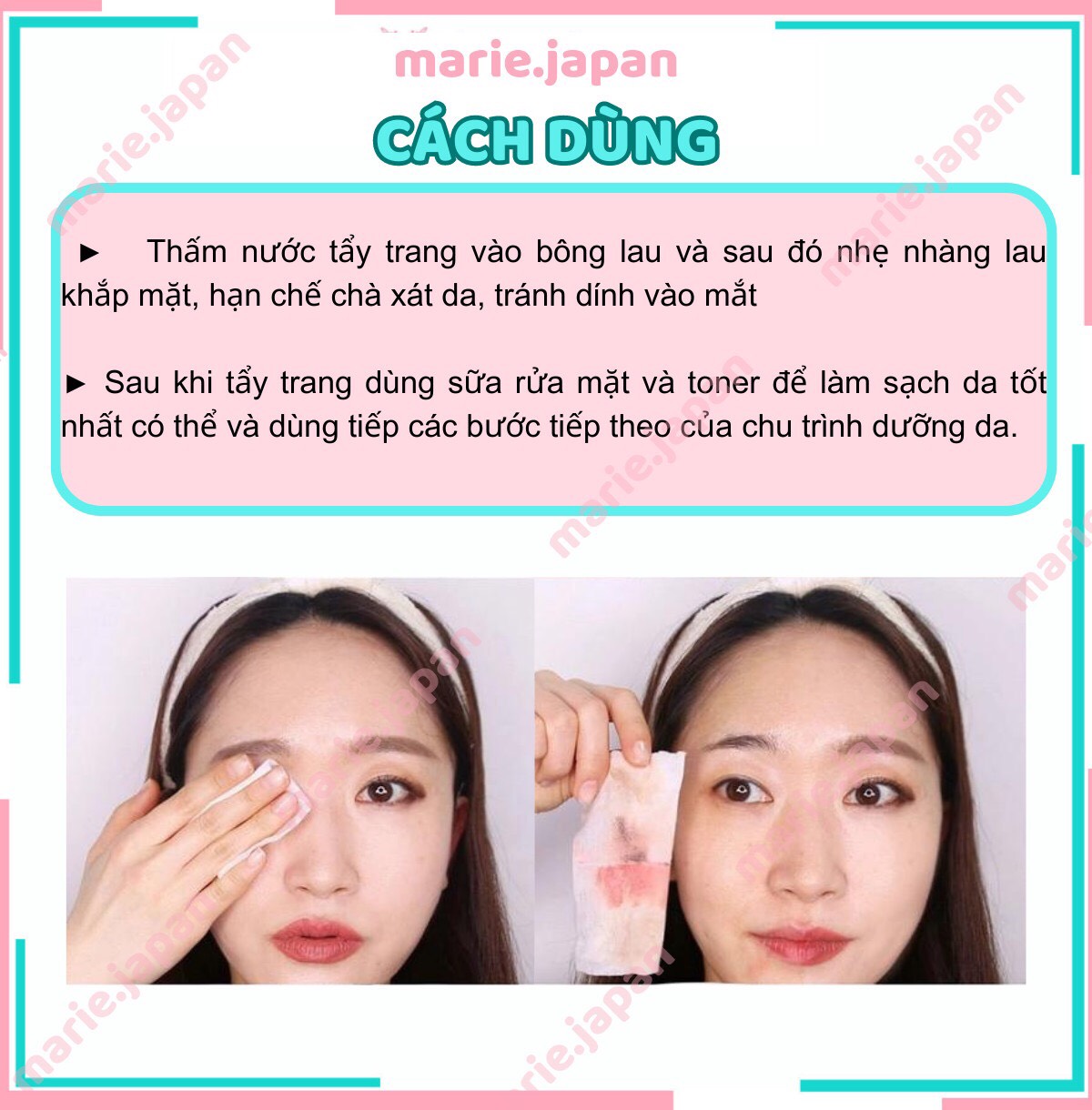 • Thấm nước tẩy trang vào bông lau và sau đó nhẹ nhàng lau khắp mặt, hạn chế chà xát da, tránh dính vào mắt, nếu dính vào mắt cần rửa kỹ lại bằng nước.