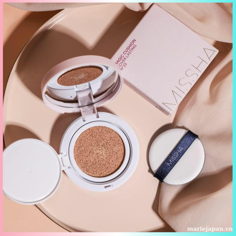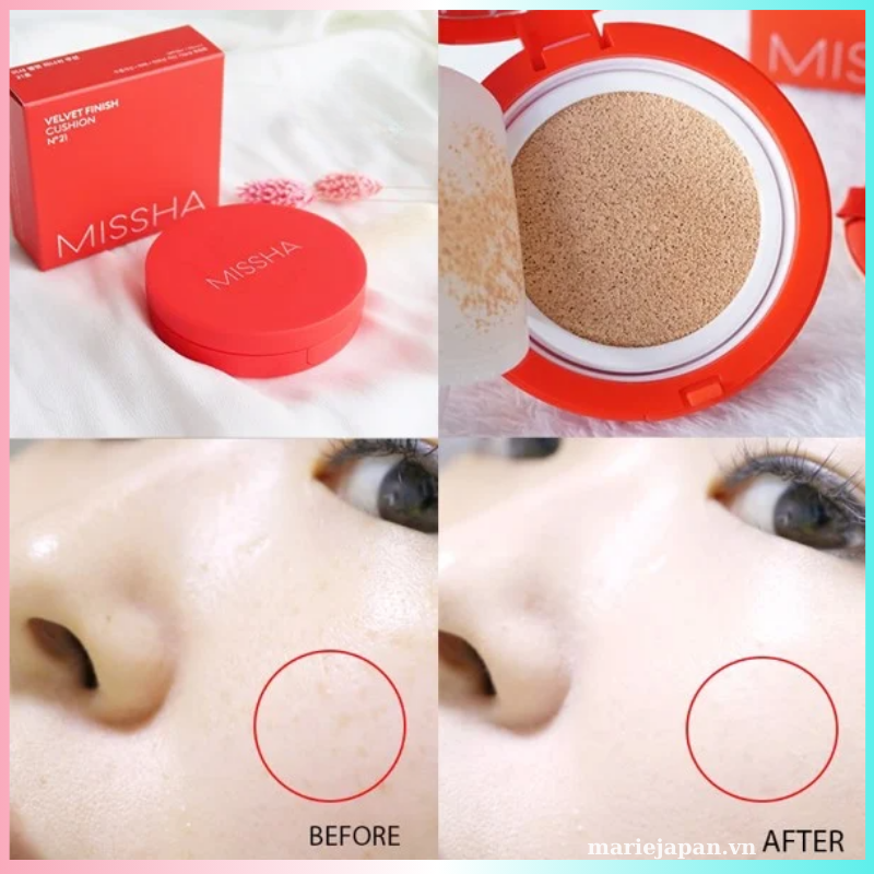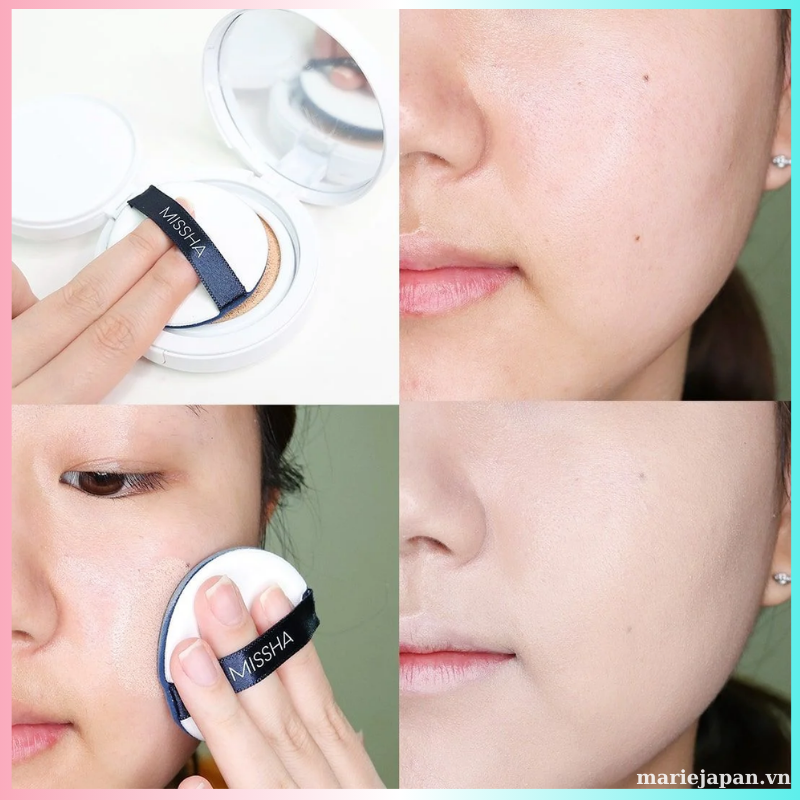 - Cushion Missha giúp điều chỉnh nâng tông da một cách tự nhiên cùng độ che phủ cao giúp dễ dàng che đi những khuyết điểm, kể cả vùng da mụn, những vùng có lỗ chân lông to hay những vùng da không đều màu.