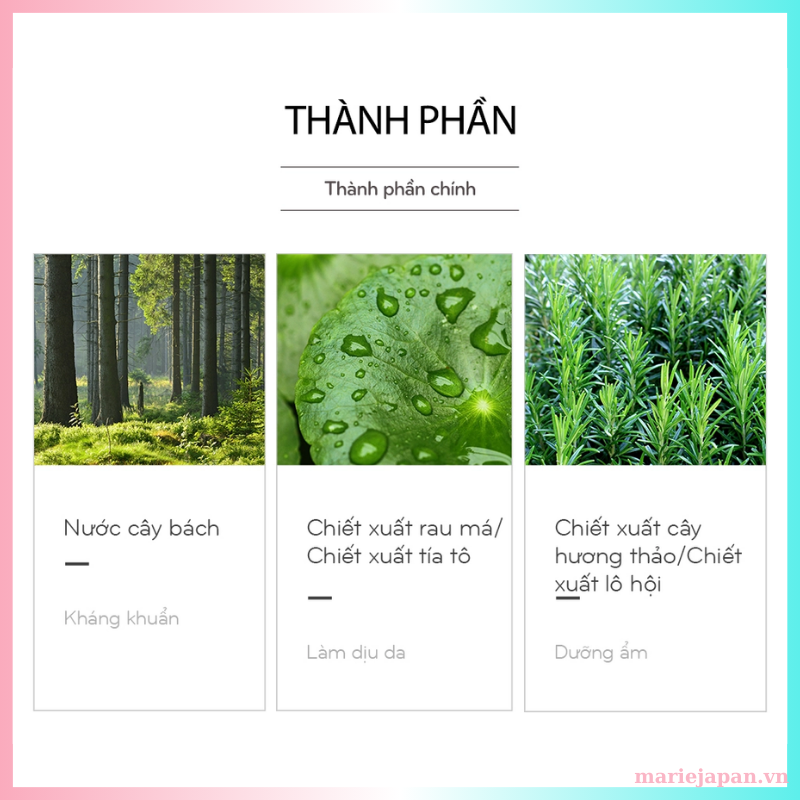 - Chứa tinh chất rau má, lô hội, cây bách (cypress), chanh và rosemary (thiên nhiên) cực kì lành tính, phù hợp nhất cho các bạn gái da dầu.
