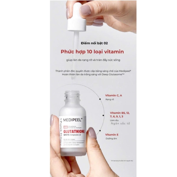 Tinh chất trắng da Medi peel Glutathione là dạng cô đặc kết hợp giữa thành phần dưỡng trắng chất lượng cao như Glutathione và vitamin B3 cùng với chiết xuất các thảo dư.ợ.c thiên nhiên an toàn, lành tính đối với da. Serum Medi-peel giúp ngăn chặn quá trình hình thành và phát triển của các sắc tố melanin đồng thời giảm đi tình trạng thâm xạm, lão hóa của da mang tới cho chị em một làn da trắng sáng không tuổi.