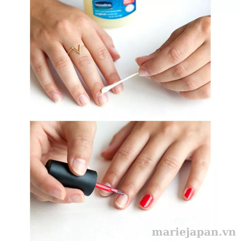 Chỉ cần bôi một chút Vaseline sẽ giúp móng tay trông bóng, khoẻ. Ngoài ra, bạn cũng có thể thử dùng hỗn hợp kem đánh răng, sáp dưỡng Vaseline và nước cốt chanh khi cần tẩy màu móng cũ.