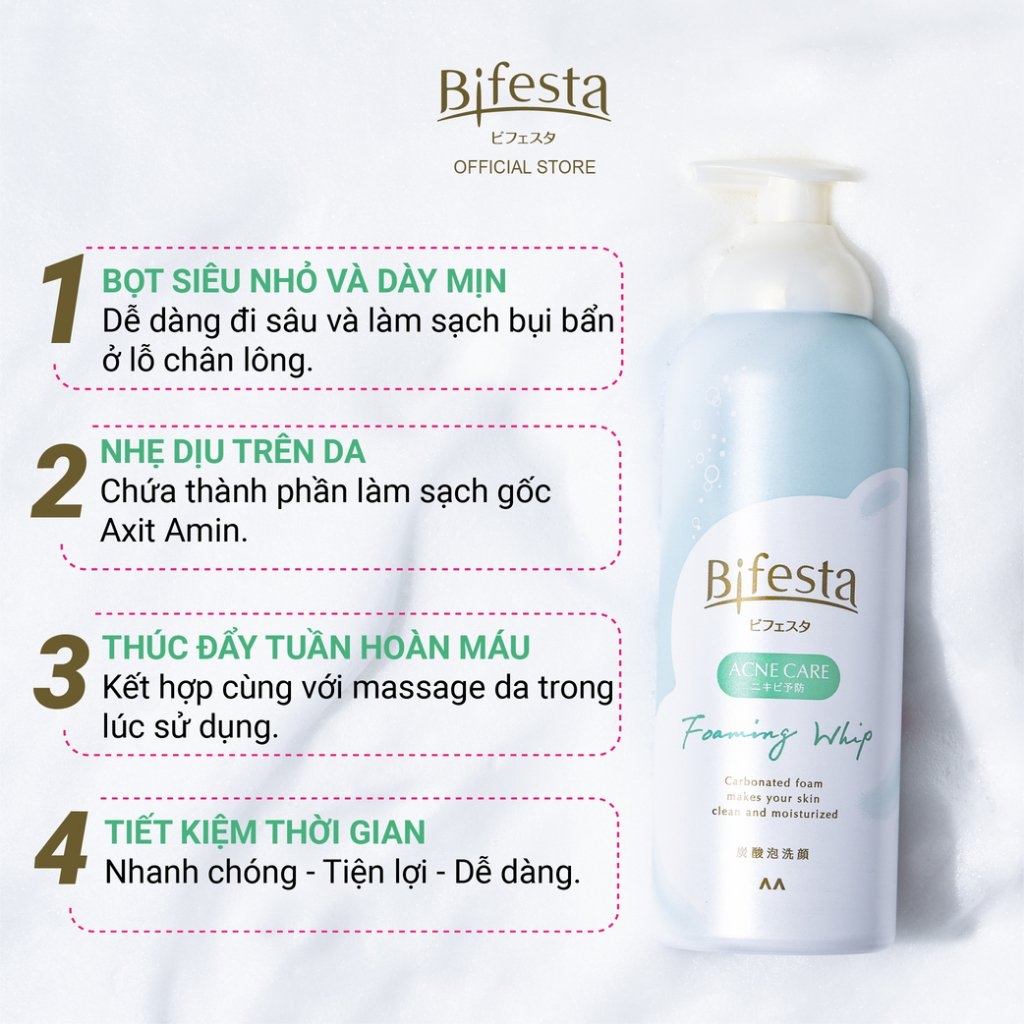 - Sữa rửa mặt dạng bọt sạch sâu, sáng da Bifesta Foaming Whip ACNE CARE 180G vỚI khoảng 40 triệu bong bóng siêu nhỏ dày mịn được tạo ra bởi axit carbonic đi sâu vào lỗ chân lông và hấp thụ bụi bẩn và mang lại cảm giác dịu nhẹ trên da.