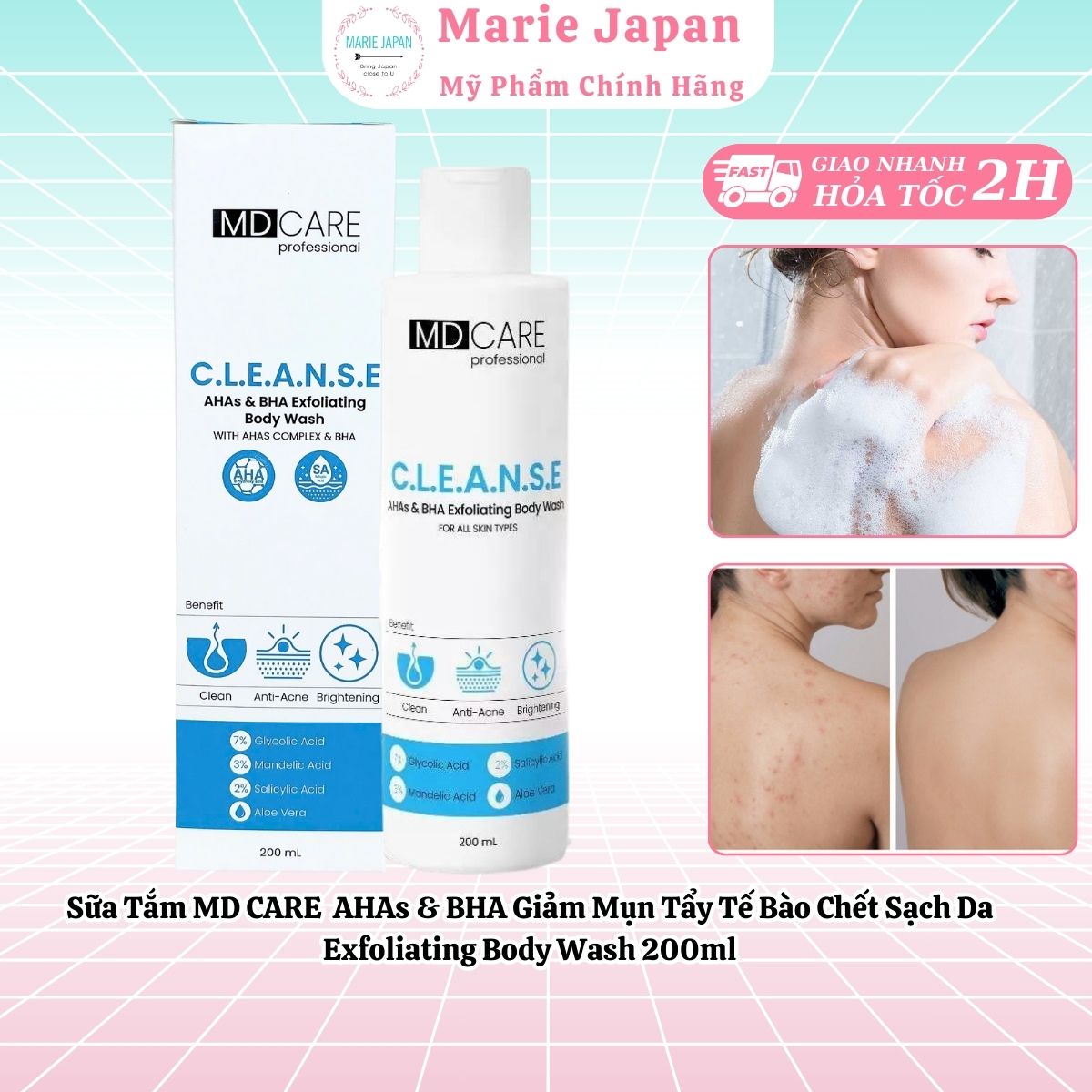 Sữa Tắm MD Care Cleanser AHA & BHA Exfoliating Body Wash Làm Sạch Da Giảm Mụn Cơ Thể Chai 200ml