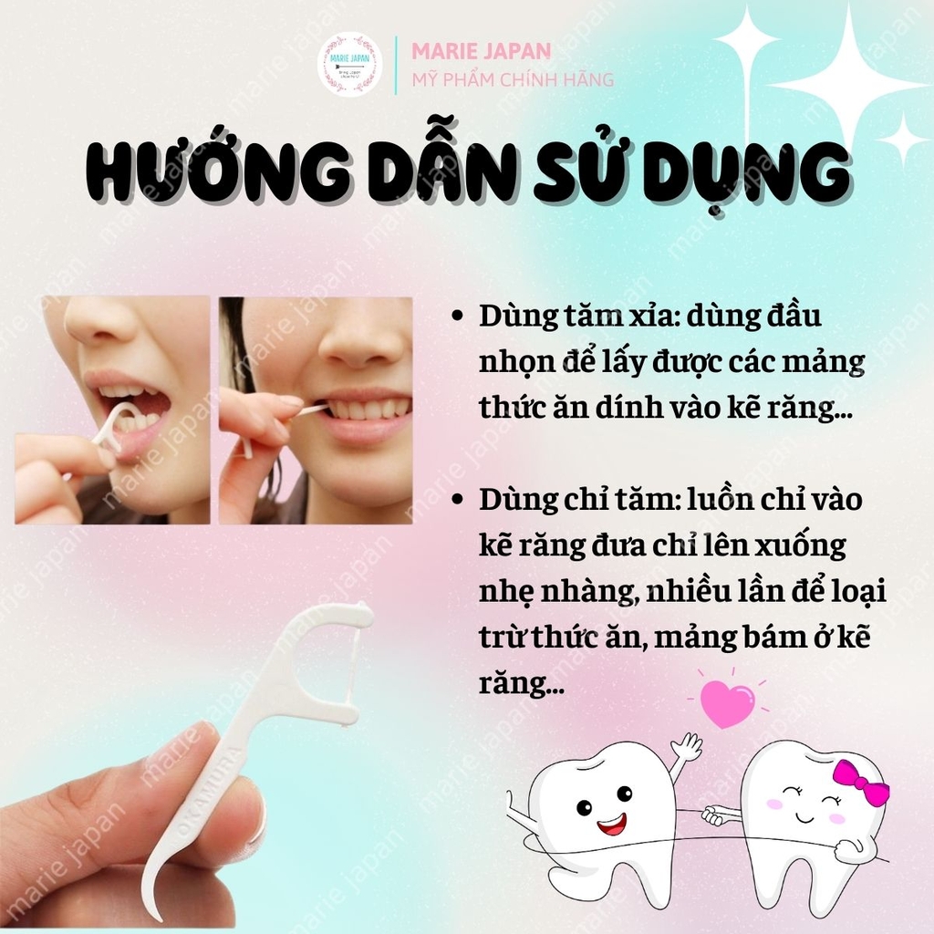 - Sản phẩm là sự kết hợp giữa chỉ tơ nha khoa và tăm xỉa răng, một đầu dùng như tăm chỉ nha khoa, một đầu dùng như tăm xỉa răng với chất liệu bằng nhựa mềm không làm hại nướu, giúp giữ răng miệng sạch và khỏe.