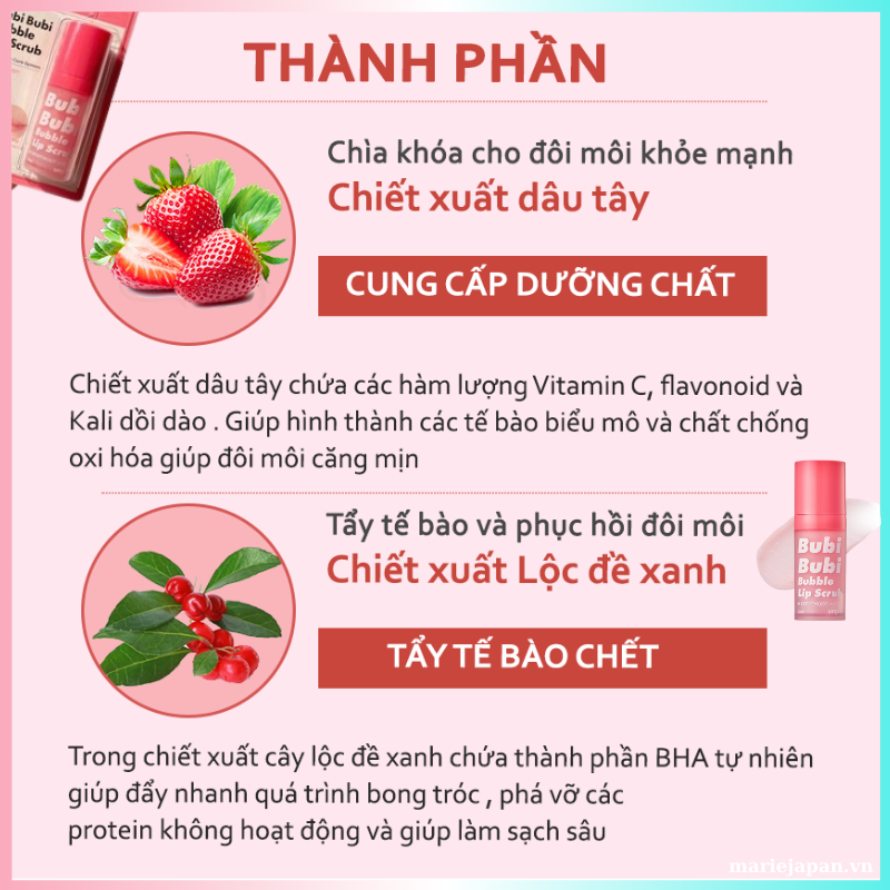 Trên đây là những thông tin về Tẩy tế bào chết môi Bubi Bubi Bubble Lip Scrub Red sủi bọt. Nếu có thắc mắc về sản phẩm hãy nhắn ngay cho Marie Japan để được tư vấn cụ thể nhé! Để đôi môi của mình luôn căng mọng và xinh đẹp tự nhiên thì mua ngay Tẩy tế bào chết môi Bubi Bubi Bubble Lip Scrub Red sủi bọt chính hãng tại Marie Japan nhé!