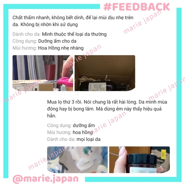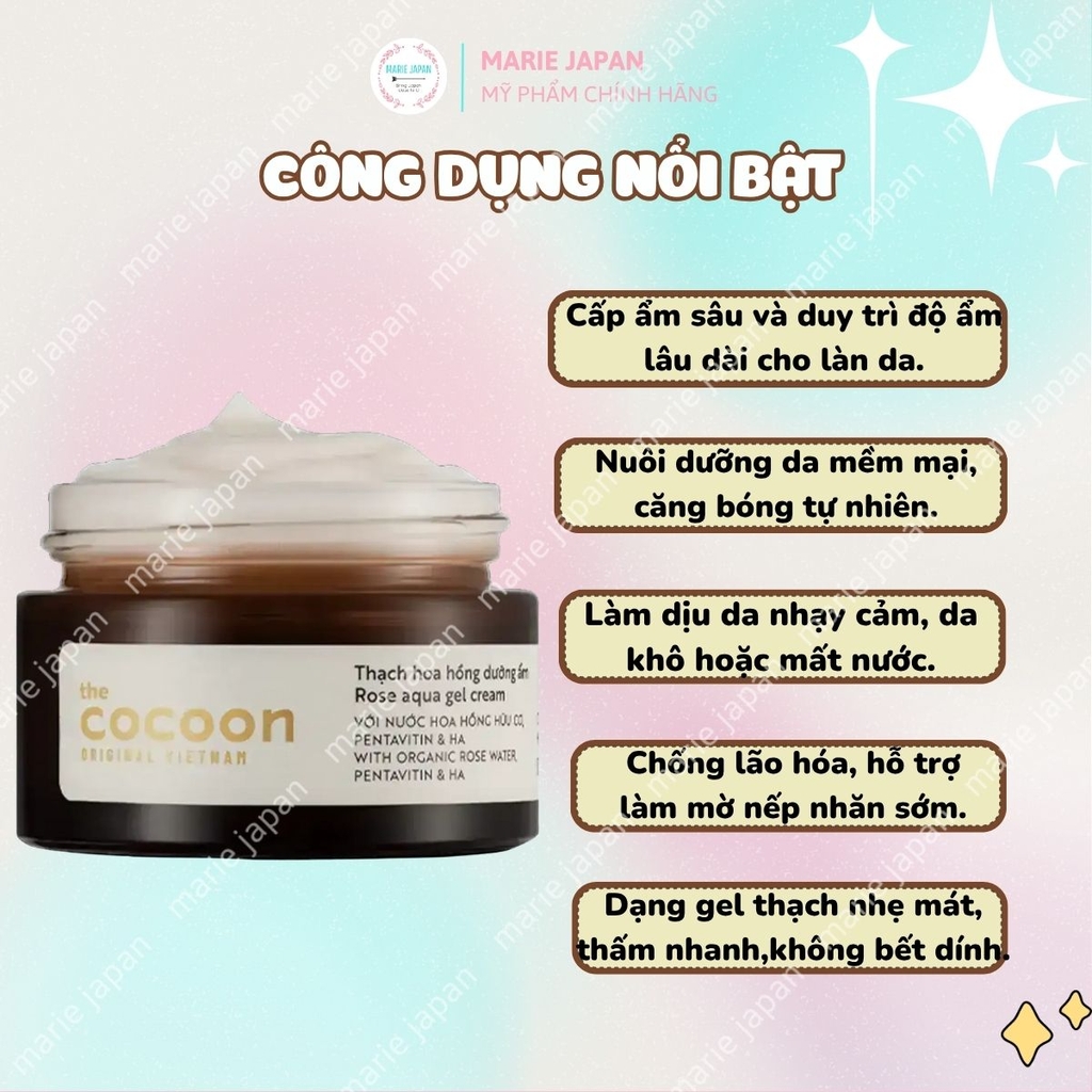 Với thành phần hoàn toàn từ thiên nhiên và công dụng dưỡng ẩm sâu, thạch hoa hồng dưỡng ẩm Cocoon chính là sản phẩm lý tưởng để chăm sóc làn da khô, thiếu nước của chị em. Chỉ sau một thời gian ngắn sử dụng, nàng sẽ cảm nhận được làn da mềm mại, căng bóng và khỏe mạnh hơn bao giờ hết. Ghé Marie Japan rinh một em về nhà và trải nghiệm ngay nhé!