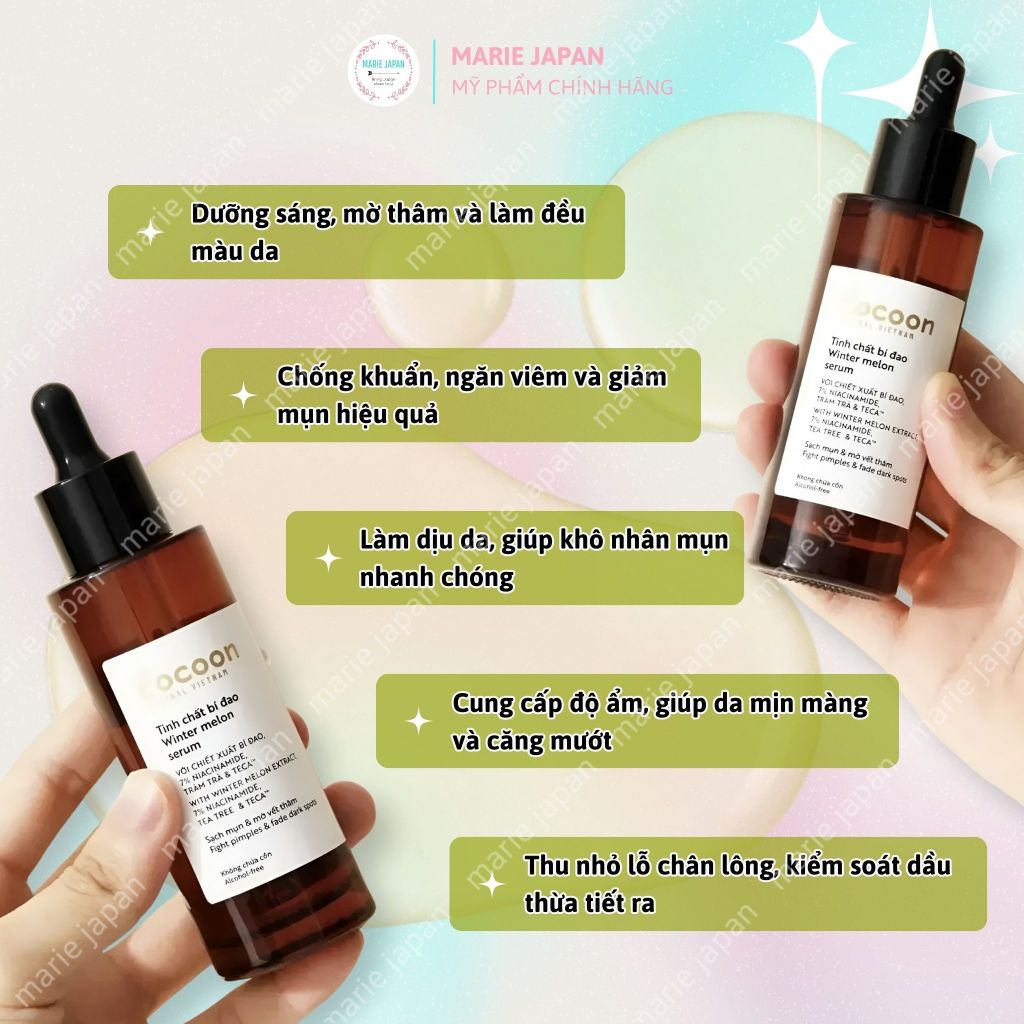 TINH CHẤT BÍ ĐAO COCOON WINER MELON SERUM 70ML là dòng sản phẩm chăm sóc da mụn của thương hiệu mỹ phẩm thuần chay Cocoon xuất xứ Việt Nam. Sản phẩm chứa các thành phần từ thực vật làm chủ đạo gồm chiết xuất bí đao, rau má, tràm trà và được bổ sung thêm 7% Niacinamide (vitamin B3) giúp hỗ trợ phục hồi tình trạng da mụn viêm và ửng đỏ hiệu quả, mang lại làn da thông thoáng và sáng mịn màng.