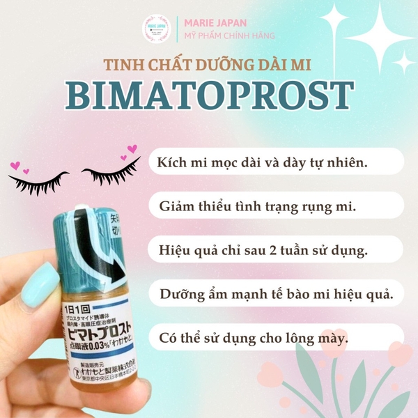 - Tinh chất dưỡng dài mi Bimatoprost là sản phẩm có xuất xứ từ Nhật Bản, với thành phần chứa duoc chất Bimatoprost. Đây được xem là liệu pháp thẩm mỹ giúp dưỡng mi dài, dày và sậm màu hơn cho những người mi ít mi hoặc bị rụng mi.