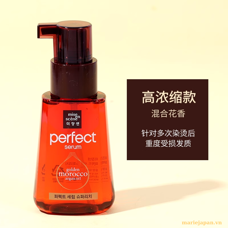 - Gel dưỡng tóc Mise En Scene Perfect Repair Hair Serum là dạng tinh chất phục hồi tóc thật hoàn hảo với chiết xuất chính từ dầu Argan, thành phần bí quyết tạo nên thương hiệu dưỡng tóc vạn- người- mê.