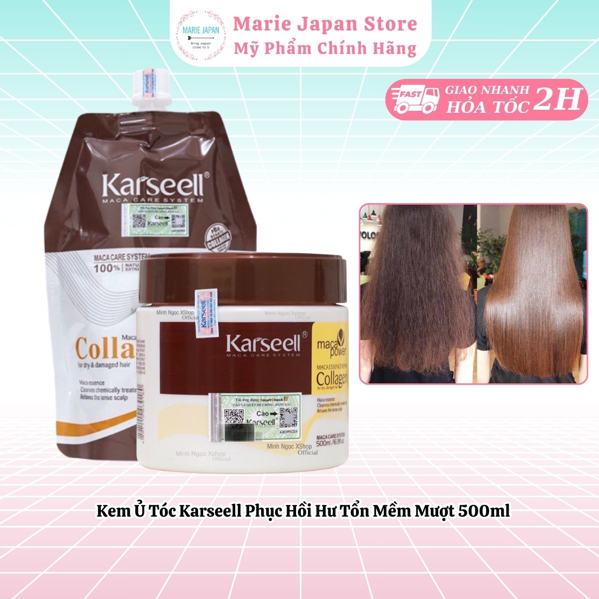- Kem ủ tóc Collagen Karseell Maca Power được các chuyên gia về tóc đánh giá là “essences dành cho tóc khô và hư tổn” với nhiều collagen tươi cộng thêm protein mang đến bộ 6 công dụng: phục hồi tóc hư tổn nặng, tăng liên kết cấu trúc tóc, giúp sợi tóc dai khỏe, cấp ẩm giúp tóc hết khô xơ, nhất là đào thải độc tố có trong tóc và cuối cùng là loại bỏ các bã nhờn dư thừa.